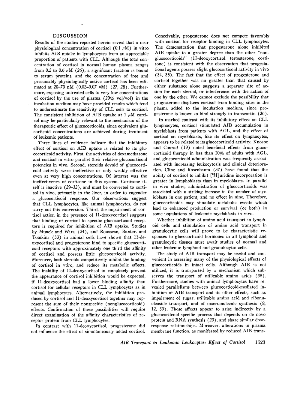 We have examined the in vitro effect of glucocorticoid and nonglucocorticoid steroids on the transport of [3-14C]alpha aminoisobutyric acid (AIB) in lymphocytes from patients with chronic lymphocytic leukemia (CLL), and myeloblasts from patients with acute granulocytic leukemia (AGL). AIB uptake by CLL lymphocytes was markedly inhibited at 1.0 μM (52±2.1%) and slightly inhibited at 0.1 μM (17±3.0%) cortisol. A similar degree of inhibition developed at 50-fold lower concentrations of dexamethasone, indicating that the effect of these steroids on AIB accumulation parallels their glucocorticoid activity in vivo. In contrast, minimal or no inhibition was observed with steroids devoid of glucocorticoid activity (progesterone, testosterone, cortisone). 11-deoxycortisol, a nonglucocorticoid known to impede the binding of cortisol to cellular receptors in animal lymphocytes, failed to inhibit AIB uptake by CLL lymphocytes appreciably, but reduced the effect of cortisol to a statistically significant degree. Hence, cortisol-induced inhibition of AIB transport in CLL lymphocytes is related to its glucocorticoid activity and appears to require initial interaction with glucocorticoid-specific cellular receptors.