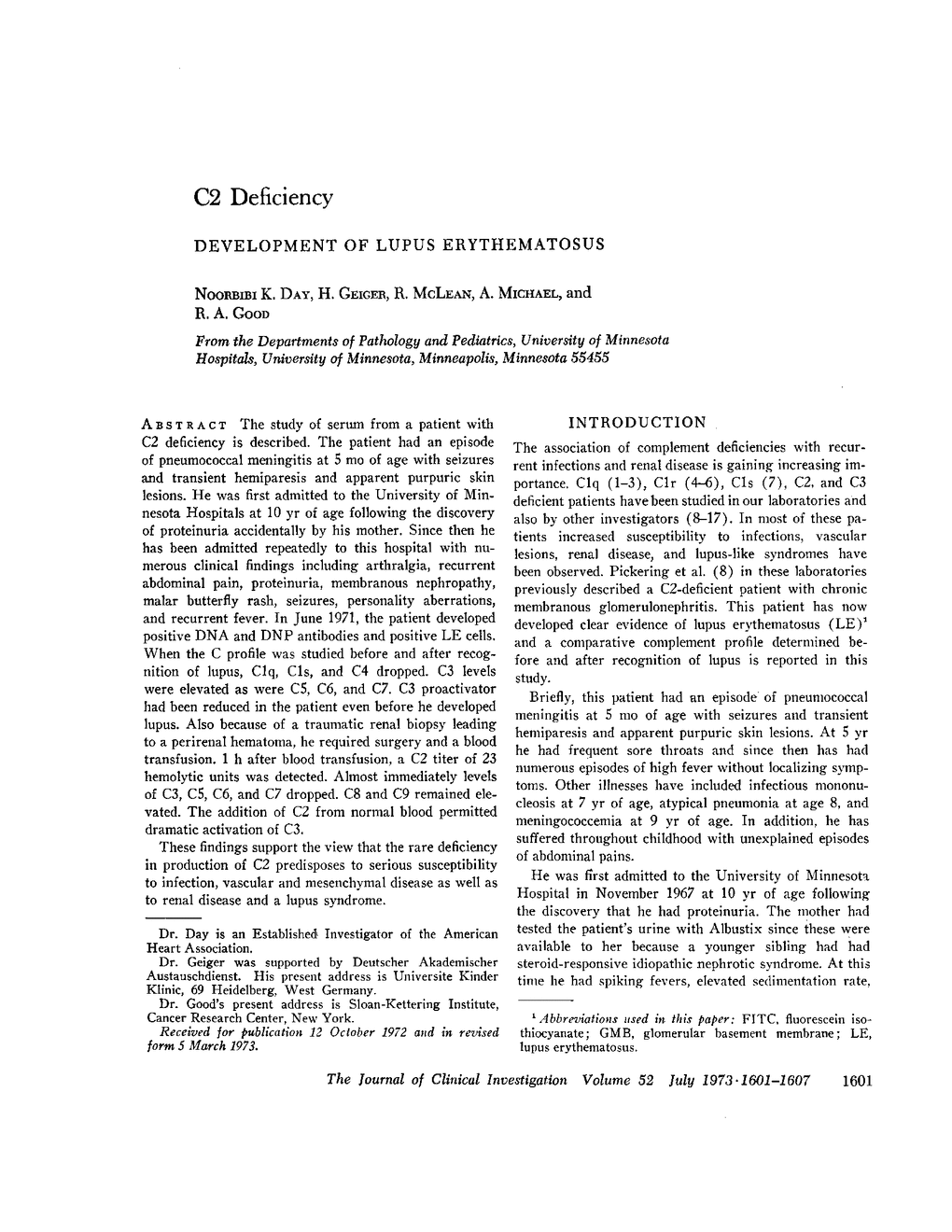 The study of serum from a patient with C2 deficiency is described. The patient had an episode of pneumococcal meningitis at 5 mo of age with seizures and transient hemiparesis and apparent purpuric skin lesions. He was first admitted to the University of Minnesota Hospitals at 10 yr of age following the discovery of proteinuria accidentally by his mother. Since then he has been admitted repeatedly to this hospital with numerous clinical findings including arthralgia, recurrent abdominal pain, proteinuria, membranous nephropathy, malar butterfly rash, seizures, personality aberrations, and recurrent fever. In June 1971, the patient developed positive DNA and DNP antibodies and positive LE cells. When the C profile was studied before and after recognition of lupus, C1q, C1s, and C4 dropped. C3 levels were elevated as were C5, C6, and C7, C3 proactivator had been reduced in the patient even before he developed lupus. Also because of a traumatic renal biopsy leading to a perirenal hematoma, he required surgery and a blood transfusion. 1 h after blood transfusion, a C2 titer of 23 hemolytic units was detected. Almost immediately levels of C3, C5, C6, and C7 dropped, C8 and C9 remained elevated. The addition of C2 from normal blood permitted dramatic activation of C3.