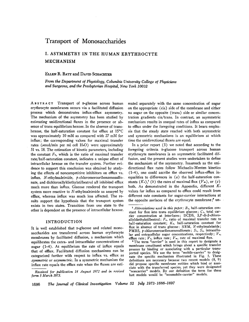 Transport of D-glucose across human erythrocyte membranes occurs via a facilitated diffusion process which demonstrates influx-efflux asymmetry. The mechanism of the asymmetry has been studied by estimating unidirectional fluxes in the presence or absence of trans equilibrium hexose. In the absence of transhexose, the half-saturation constant for efflux at 15°C was approximately 10 mM as compared with 27 mM for influx; the corresponding values for maximal transfer rates (μmol/min per ml cell H2O) were approximately 51 vs. 18. The estimation of kinetic parameters, including the constant Fs, which is the ratio of maximal transfer rate/half-saturation constant, indicates a unique effect of intracellular hexose on the transfer system. Further evidence to support this conclusion was obtained by studying the effects of noncompetitive inhibitors on efflux vs. influx. N-ethylmaleimide, p-chloromercuribenzenesulfonate, and dichloroallyldiethylstilbestrol all inhibited efflux much more than influx. Glucose rendered the transport system more reactive to N-ethylmaleimide as assayed by efflux, whereas influx was much less affected. The results support the hypothesis that the transport system exists in two states. Transition from one state to the other is dependent on the presence of intracellular hexose.