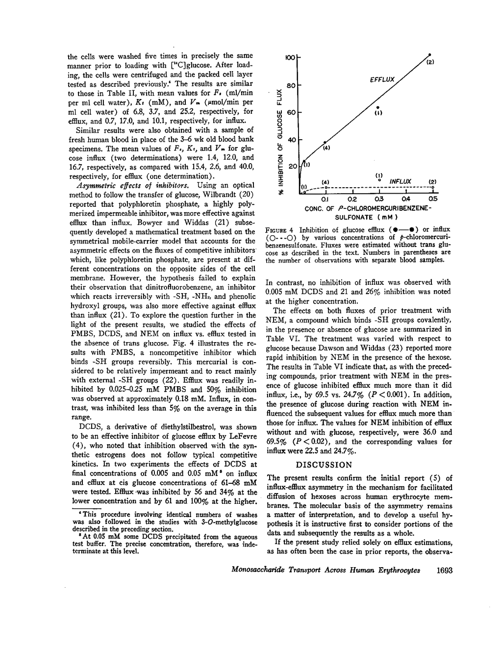 Transport of D-glucose across human erythrocyte membranes occurs via a facilitated diffusion process which demonstrates influx-efflux asymmetry. The mechanism of the asymmetry has been studied by estimating unidirectional fluxes in the presence or absence of trans equilibrium hexose. In the absence of transhexose, the half-saturation constant for efflux at 15°C was approximately 10 mM as compared with 27 mM for influx; the corresponding values for maximal transfer rates (μmol/min per ml cell H2O) were approximately 51 vs. 18. The estimation of kinetic parameters, including the constant Fs, which is the ratio of maximal transfer rate/half-saturation constant, indicates a unique effect of intracellular hexose on the transfer system. Further evidence to support this conclusion was obtained by studying the effects of noncompetitive inhibitors on efflux vs. influx. N-ethylmaleimide, p-chloromercuribenzenesulfonate, and dichloroallyldiethylstilbestrol all inhibited efflux much more than influx. Glucose rendered the transport system more reactive to N-ethylmaleimide as assayed by efflux, whereas influx was much less affected. The results support the hypothesis that the transport system exists in two states. Transition from one state to the other is dependent on the presence of intracellular hexose.