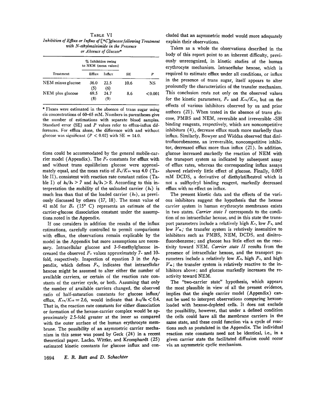 Transport of D-glucose across human erythrocyte membranes occurs via a facilitated diffusion process which demonstrates influx-efflux asymmetry. The mechanism of the asymmetry has been studied by estimating unidirectional fluxes in the presence or absence of trans equilibrium hexose. In the absence of transhexose, the half-saturation constant for efflux at 15°C was approximately 10 mM as compared with 27 mM for influx; the corresponding values for maximal transfer rates (μmol/min per ml cell H2O) were approximately 51 vs. 18. The estimation of kinetic parameters, including the constant Fs, which is the ratio of maximal transfer rate/half-saturation constant, indicates a unique effect of intracellular hexose on the transfer system. Further evidence to support this conclusion was obtained by studying the effects of noncompetitive inhibitors on efflux vs. influx. N-ethylmaleimide, p-chloromercuribenzenesulfonate, and dichloroallyldiethylstilbestrol all inhibited efflux much more than influx. Glucose rendered the transport system more reactive to N-ethylmaleimide as assayed by efflux, whereas influx was much less affected. The results support the hypothesis that the transport system exists in two states. Transition from one state to the other is dependent on the presence of intracellular hexose.