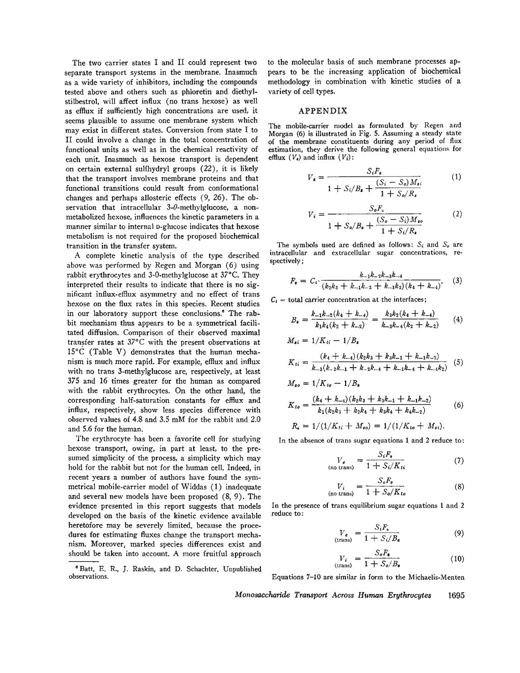 Transport of D-glucose across human erythrocyte membranes occurs via a facilitated diffusion process which demonstrates influx-efflux asymmetry. The mechanism of the asymmetry has been studied by estimating unidirectional fluxes in the presence or absence of trans equilibrium hexose. In the absence of transhexose, the half-saturation constant for efflux at 15°C was approximately 10 mM as compared with 27 mM for influx; the corresponding values for maximal transfer rates (μmol/min per ml cell H2O) were approximately 51 vs. 18. The estimation of kinetic parameters, including the constant Fs, which is the ratio of maximal transfer rate/half-saturation constant, indicates a unique effect of intracellular hexose on the transfer system. Further evidence to support this conclusion was obtained by studying the effects of noncompetitive inhibitors on efflux vs. influx. N-ethylmaleimide, p-chloromercuribenzenesulfonate, and dichloroallyldiethylstilbestrol all inhibited efflux much more than influx. Glucose rendered the transport system more reactive to N-ethylmaleimide as assayed by efflux, whereas influx was much less affected. The results support the hypothesis that the transport system exists in two states. Transition from one state to the other is dependent on the presence of intracellular hexose.