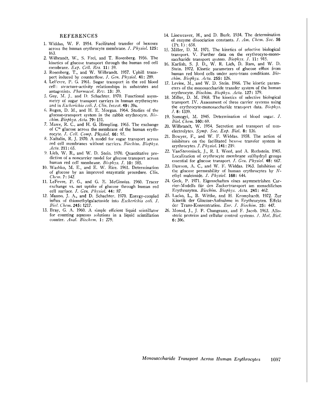 Transport of D-glucose across human erythrocyte membranes occurs via a facilitated diffusion process which demonstrates influx-efflux asymmetry. The mechanism of the asymmetry has been studied by estimating unidirectional fluxes in the presence or absence of trans equilibrium hexose. In the absence of transhexose, the half-saturation constant for efflux at 15°C was approximately 10 mM as compared with 27 mM for influx; the corresponding values for maximal transfer rates (μmol/min per ml cell H2O) were approximately 51 vs. 18. The estimation of kinetic parameters, including the constant Fs, which is the ratio of maximal transfer rate/half-saturation constant, indicates a unique effect of intracellular hexose on the transfer system. Further evidence to support this conclusion was obtained by studying the effects of noncompetitive inhibitors on efflux vs. influx. N-ethylmaleimide, p-chloromercuribenzenesulfonate, and dichloroallyldiethylstilbestrol all inhibited efflux much more than influx. Glucose rendered the transport system more reactive to N-ethylmaleimide as assayed by efflux, whereas influx was much less affected. The results support the hypothesis that the transport system exists in two states. Transition from one state to the other is dependent on the presence of intracellular hexose.