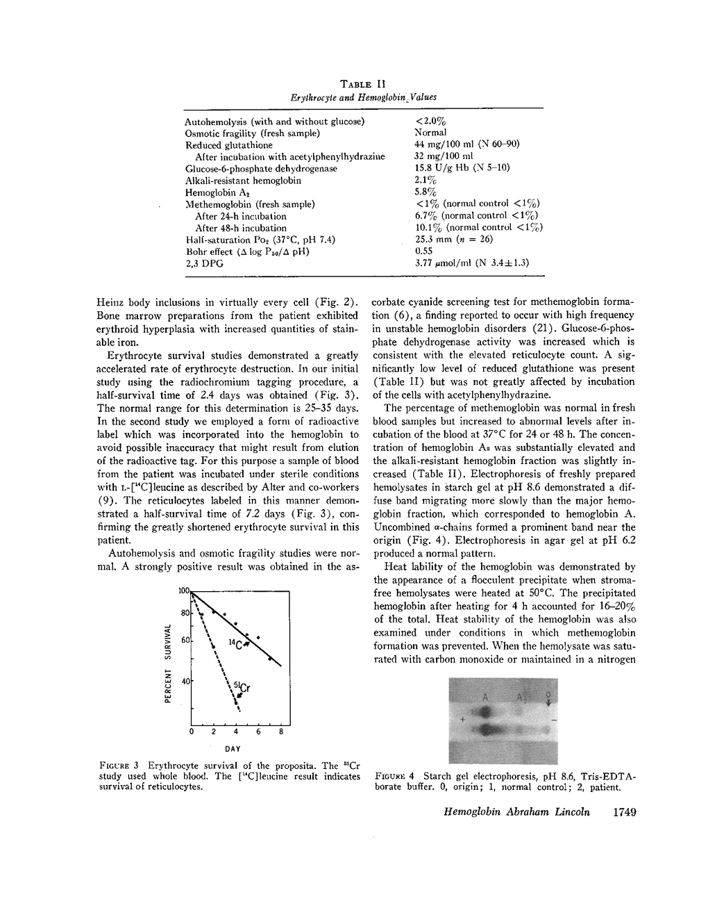 An unstable hemoglobin variant was identified in a Negro woman with hemolytic anemia since infancy. A splenectomy had been performed when the patient was a child. The anemia was accompanied by erythrocyte inclusion bodies and excretion of darkly pigmented urine. Neither parent of the proposita demonstrated any hematologic abnormality, and it appeared that this hemoglobin variant arose as a new mutation. Erythrocyte survival in the patient was greatly reduced: the erythrocyte t½ using radiochromium as a tag was 2.4 days, and a reticulocyte survival study performed after labeling the cells with L-[14C]leucine indicated a t½ of 7.2 days. When stroma-free hemolysates were heated at 50°C, 16-20% of the hemoglobin precipitated. The thermolability was prevented by the addition of hemin, carbon monoxide, or dithionite, suggesting an abnormality of heme binding. An increased rate of methemoglobin formation was also observed after incubation of erythrocytes at 37°C. The abnormal hemoglobin could not be separated from hemoglobin A by electrophoresis or chromatography, but it was possible to isolate the variant β-chain by precipitation with p-hydroxymercuribenzoate. Purification of the β-chain by column chromatography followed by peptide mapping and amino acid analysis demonstrated a substitution of proline for β32 leucine. It appears likely that a major effect of this substitution is a disruption of the normal orientation of the adjacent leucine residue at β31 to impair heme stabilization.