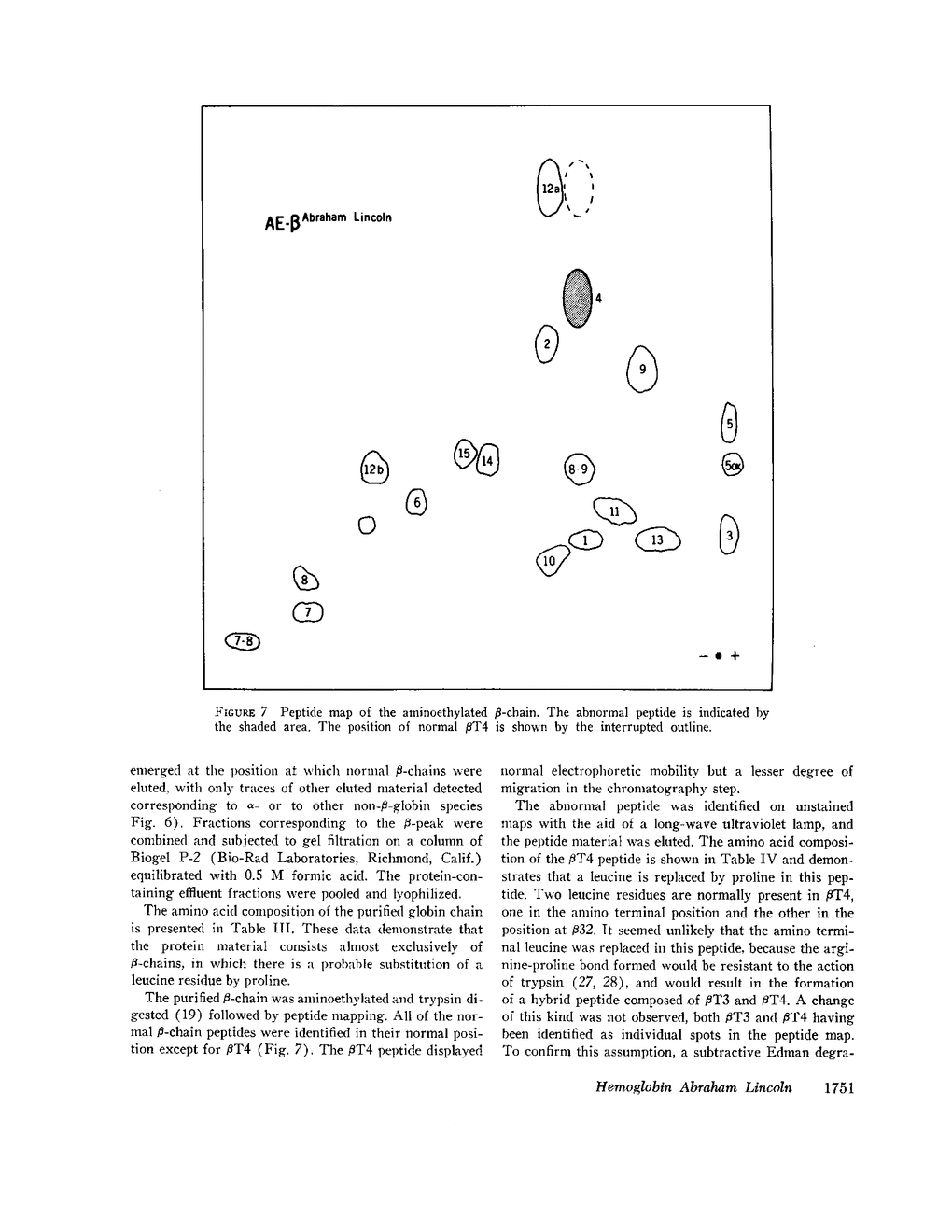 An unstable hemoglobin variant was identified in a Negro woman with hemolytic anemia since infancy. A splenectomy had been performed when the patient was a child. The anemia was accompanied by erythrocyte inclusion bodies and excretion of darkly pigmented urine. Neither parent of the proposita demonstrated any hematologic abnormality, and it appeared that this hemoglobin variant arose as a new mutation. Erythrocyte survival in the patient was greatly reduced: the erythrocyte t½ using radiochromium as a tag was 2.4 days, and a reticulocyte survival study performed after labeling the cells with L-[14C]leucine indicated a t½ of 7.2 days. When stroma-free hemolysates were heated at 50°C, 16-20% of the hemoglobin precipitated. The thermolability was prevented by the addition of hemin, carbon monoxide, or dithionite, suggesting an abnormality of heme binding. An increased rate of methemoglobin formation was also observed after incubation of erythrocytes at 37°C. The abnormal hemoglobin could not be separated from hemoglobin A by electrophoresis or chromatography, but it was possible to isolate the variant β-chain by precipitation with p-hydroxymercuribenzoate. Purification of the β-chain by column chromatography followed by peptide mapping and amino acid analysis demonstrated a substitution of proline for β32 leucine. It appears likely that a major effect of this substitution is a disruption of the normal orientation of the adjacent leucine residue at β31 to impair heme stabilization.