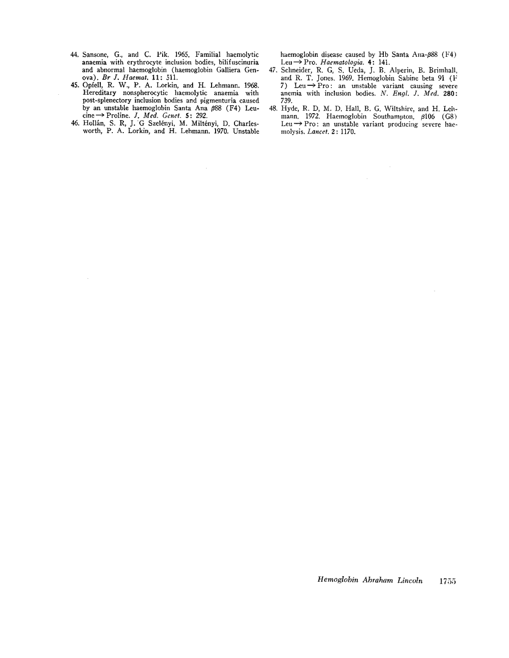 An unstable hemoglobin variant was identified in a Negro woman with hemolytic anemia since infancy. A splenectomy had been performed when the patient was a child. The anemia was accompanied by erythrocyte inclusion bodies and excretion of darkly pigmented urine. Neither parent of the proposita demonstrated any hematologic abnormality, and it appeared that this hemoglobin variant arose as a new mutation. Erythrocyte survival in the patient was greatly reduced: the erythrocyte t½ using radiochromium as a tag was 2.4 days, and a reticulocyte survival study performed after labeling the cells with L-[14C]leucine indicated a t½ of 7.2 days. When stroma-free hemolysates were heated at 50°C, 16-20% of the hemoglobin precipitated. The thermolability was prevented by the addition of hemin, carbon monoxide, or dithionite, suggesting an abnormality of heme binding. An increased rate of methemoglobin formation was also observed after incubation of erythrocytes at 37°C. The abnormal hemoglobin could not be separated from hemoglobin A by electrophoresis or chromatography, but it was possible to isolate the variant β-chain by precipitation with p-hydroxymercuribenzoate. Purification of the β-chain by column chromatography followed by peptide mapping and amino acid analysis demonstrated a substitution of proline for β32 leucine. It appears likely that a major effect of this substitution is a disruption of the normal orientation of the adjacent leucine residue at β31 to impair heme stabilization.