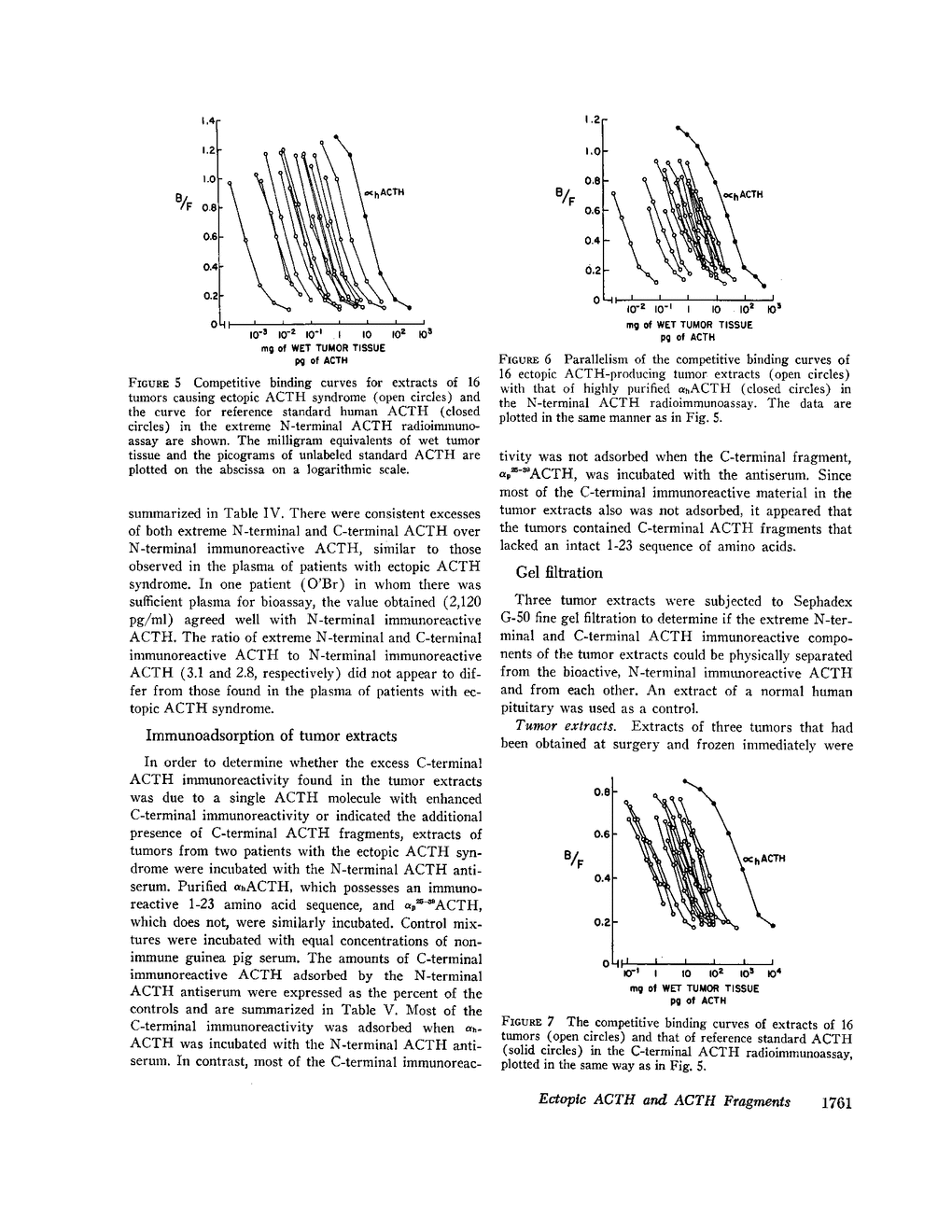 Extracts of tumors from 32 patients with the ectopic ACTH syndrome were subjected to simultaneous bioassay and radioimmunoassays for ACTH. Radioimmunoassays were performed using three antisera, one of which reacts with the extreme N-terminal 1-13 amino acid sequence of ACTH, the second with the N-terminal 1-23 sequence of the ACTH molecule, and the third with the C-terminal 25-39 amino acid sequence of ACTH. There was, in general, good correlation between bioactivity and N-terminal ACTH immunoreactivity. However, there were large excesses of both extreme N-terminal and C-terminal immunoreactive materials in most tumor extracts, which were not found in extracts of three human pituitaries. Three tumor extracts were subjected to molecular sieve chromatography on Sephadex G-50 fine resin. The bioactive ACTH eluted in the same fractions as pituitary ACTH (mol wt≃4,500 daltons) and reacted equally in all three ACTH radioimmunoassay systems. The bioactive tumor ACTH was neutralized by incubation with the C-terminal antiserum, indicating it has an intact C-terminal sequence of amino acids. The next several fractions from the Sephadex column contained a material, mol wt≃3,100, which was biologically inactive and had C-terminal immunoreactivity but no N-terminal or extreme N-terminal immunoreactivity. Incubation with the N-terminal 1-23 ACTH antiserum did not adsorb these C-terminal fragments, indicating they lacked an intact sequence of amino acids in this region. A smaller ACTH fragment (mol wt≃1,800 daltons) eluted in still later fractions and reacted with the extreme N-terminal antiserum but not with the N-terminal or C-terminal antisera. It had no steroidogenic activity, but appeared to have significant melanocyte-stimulating activity. It is concluded that, in addition to an ACTH similar, if not identical, to pituitary ACTH, tumors of patients with the ectopic ACTH syndrome contain both N-terminal and C-terminal ACTH fragments.