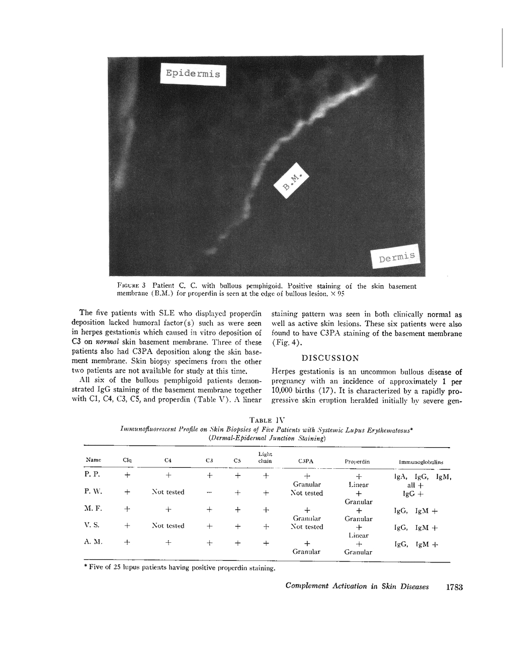 A patient with herpes gestationis, 6 of 6 patients with bullous pemphigoid, and 5 of 25 patients with systemic lupus erythematosus were found to have properdin deposited along the skin basement membrane.
