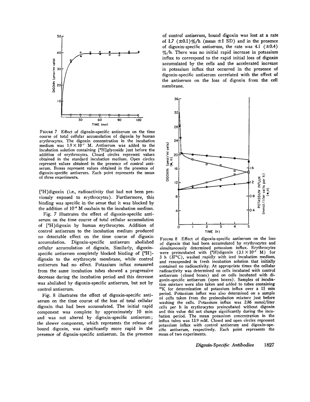 The present studies indicate that accumulation of digoxin by intact human erythrocytes is the result of two processes: binding of digoxin to the erythrocyte membrane and uptake of digoxin across the membrane into the cell. In contrast, accumulation of ouabain by human erythrocytes is entirely attributable to binding of this glycoside to the plasma membrane. Digoxin binding to the erythrocyte membrane involves a single class of binding sites, is a saturable function of the extracellular digoxin concentration, reversible, temperature-sensitive, dependent on the cation composition of the incubation medium, inhibited by other cardioactive steroids, and correlates with the inhibition of erythrocyte potassium influx. Digoxin uptake across the membrane into the cell is also temperature-sensitive and reversible but is a linear function of the extracellular digoxin concentration, not altered by changes in the cation composition of the incubation medium, not inhibited by other cardioactive steroids, and does not correlate with inhibition of erythrocyte potassium influx. Digoxinspecific antibodies can both prevent and reverse effects of digoxin on potassium influx in human erythrocytes by virtue of the capacity of the antibodies to decrease the amount of digoxin that is bound to the erythrocyte membrane. These antibodies also reduce uptake of digoxin across the plasma membrane into the erythrocyte; however, this portion of cellular digoxin is not responsible for the observed inhibition of potassium influx. In the presence of digoxin-specific antibodies, the changes in digoxin binding to the erythrocyte membrane and in digoxin uptake across the membrane into the cell reflect the ability of the antibodies to form complexes with “free” digoxin molecules in the incubation medium and thereby decrease the effective concentration of digoxin.