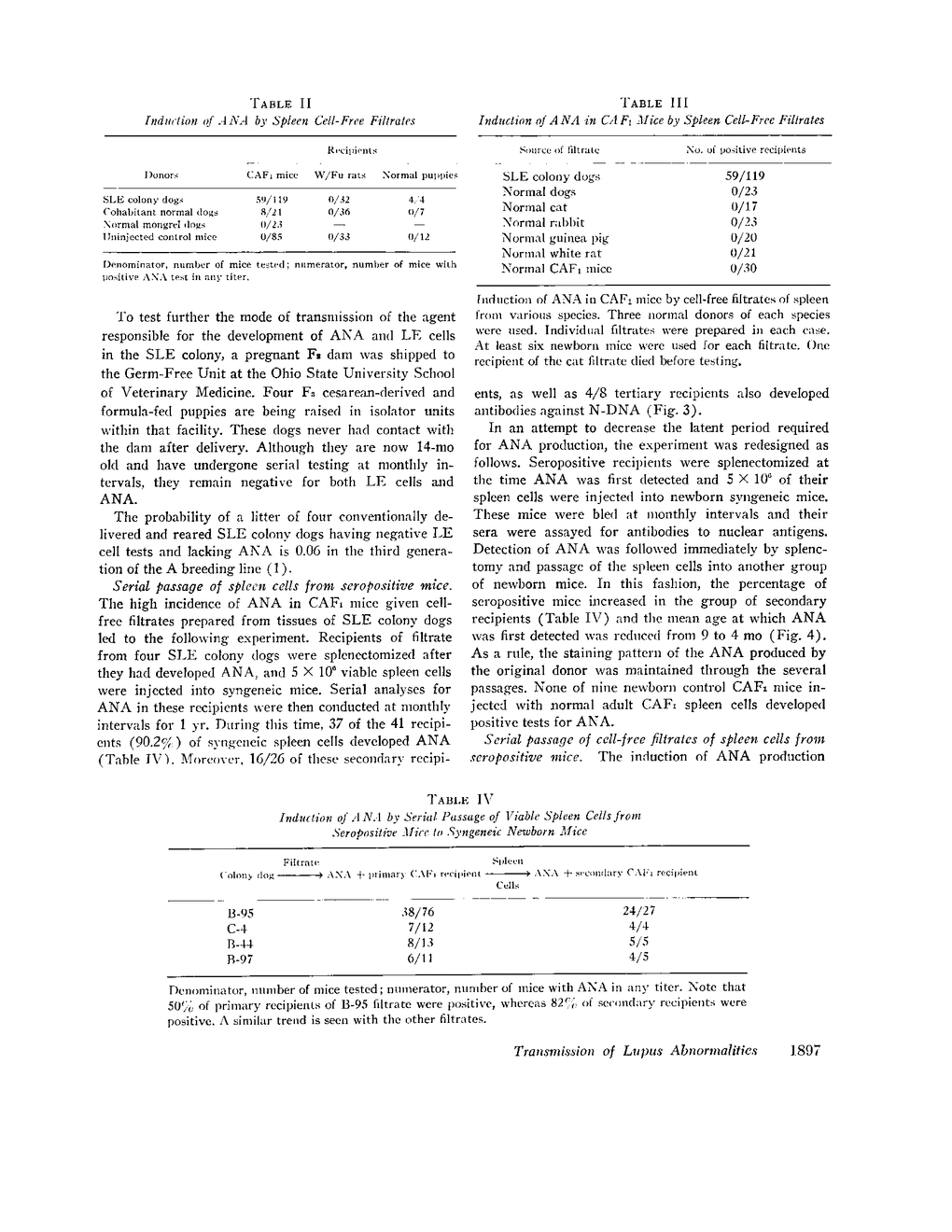 The presence of viruses was sought in a colony of dogs bred from parents with systemic lupus crythematosus (SLE). Cell-free filtrates prepared from the spleens of these animals were injected into newborn dogs, mice, and rats. The canine recipients developed antinuclear antibody (ANA) and positive lupus erythematosus (LE) cell tests: ANA and, in some cases, antinative DNA antibodies were produced by the murine recipients: no abnormalities were detected in the rats. Serial passage of spleen cells or cell-free filtrates of spleen tissue in syngeneic mice reduced the time required for appearance of ANA from 9 to 4 mo. Some murine recipients of the canine filtrate developed malignant lymphomas. Murine leukemia viruses were identified in these tumors by electron microscopic, virologic, and serologic technics. These neoplasms, but not other tumors known to contain murine leukemia viruses, were associated with the production of ANA. Puppies inoculated with the canine filtrate-induced mouse lymphoma developed ANA and positive LE cell tests within 4 mo.