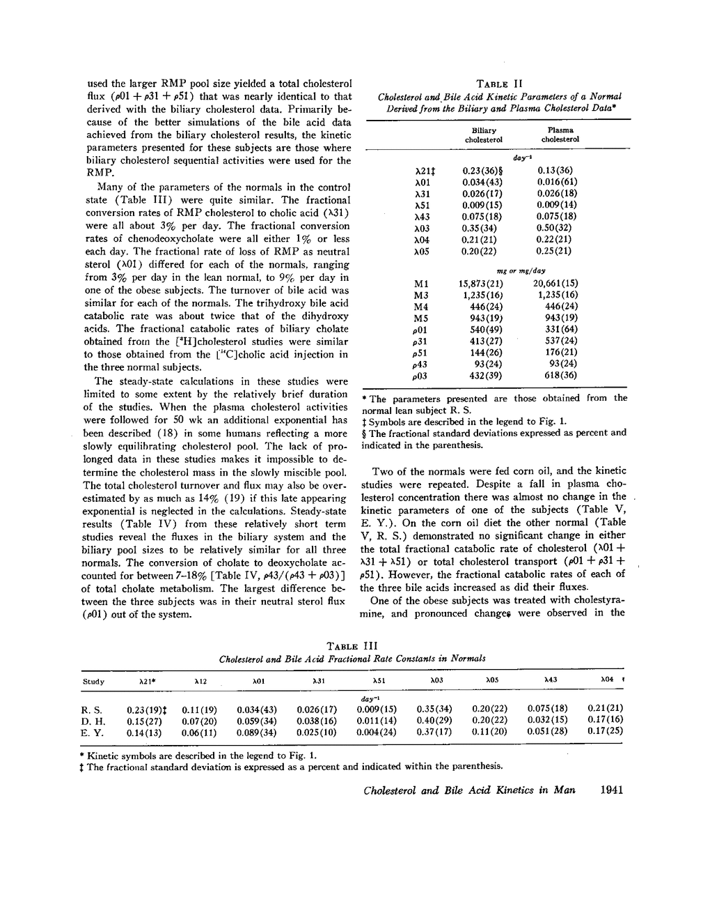 The kinetics of cholesterol and bile acid turnover were determined from an analysis of the biliary lipids after a single intravenous injection of labeled cholesterol. A compartmental model was designed for the system, and the fractional metabolic rates and fluxes were determined in one lean and two obese normal humans. Each of the normals converted about 3% per day of their rapidly miscible cholesterol pool to cholic acid and 1% per day or less to chenodeoxycholate. Cholate was catabolized at about twice the rate of the dihydroxy bile acids in these normals. Two of the normals were fed corn oil with little change in their kinetic parameters from the control state. The other normal received cholestyramine and dramatically increased the bile acid flux with little change in neutral sterol catabolism. A cirrhotic patient was also studied by this technique and noted to have kinetic parameters quite different from the normals.