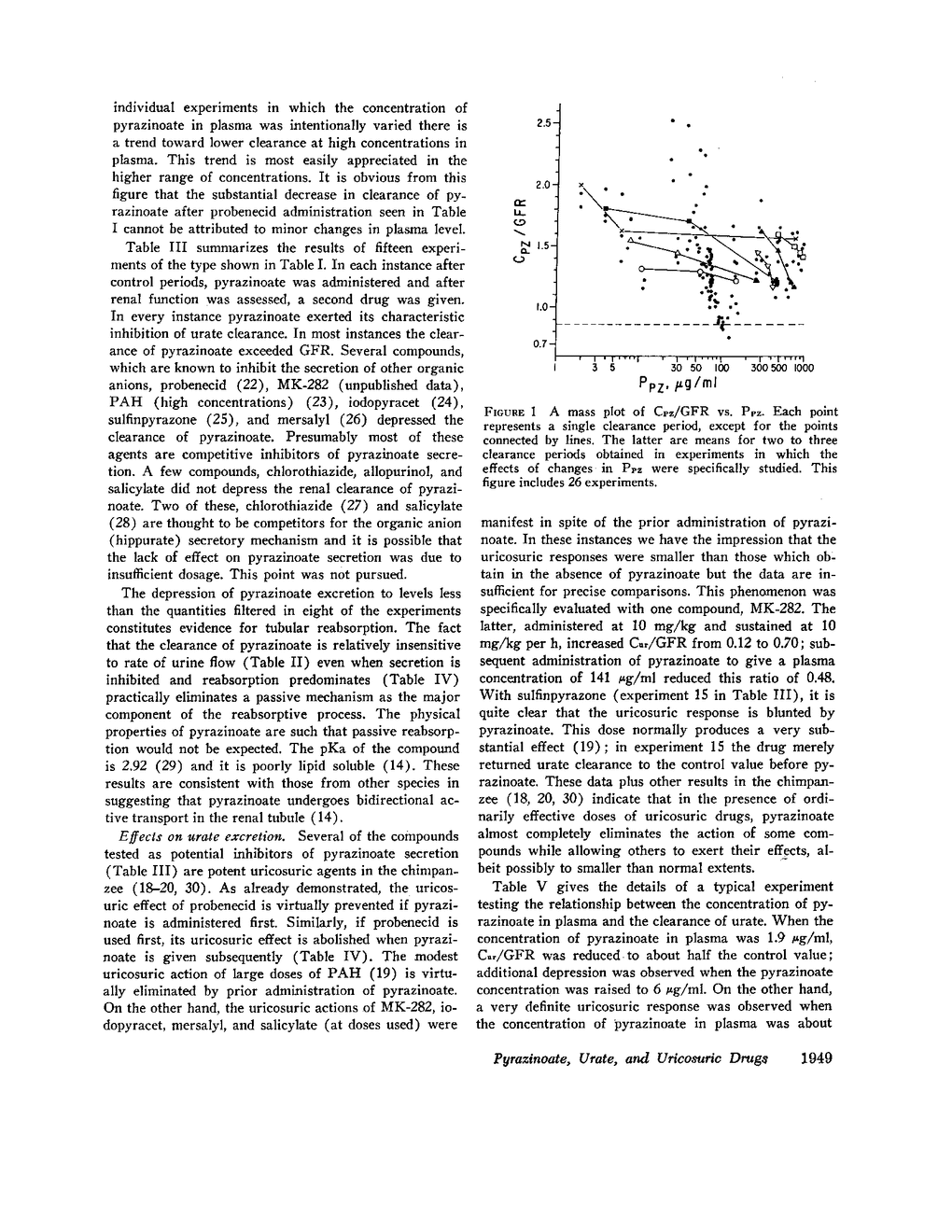 These experiments were designed to define the renal disposition of pyrazinoic acid in a nonhuman primate that is phylogenetically close to man and to relate this to the effects of pyrazinoate on urate excretion. The renal clearance of pyrazinoate was almost always greater than the simultaneous glomerular filtration rate at plasma concentrations ranging from 1.9 to 960 μg/ml. Some inhibitors of tubular secretion, probenecid, MK-282 (an experimental, potent uricosuric drug), p-aminohippurate, iodopyracet, sulfinpyrazone, and mersalyl, reduced clearances of pyrazinoate to values far below filtration rate. Chlorothiazide, allopurinol, and salicylate did not. The clearance of pyrazinoate was not influenced by changes in urine flow. It is concluded that pyrazinoate is actively secreted and actively reabsorbed.