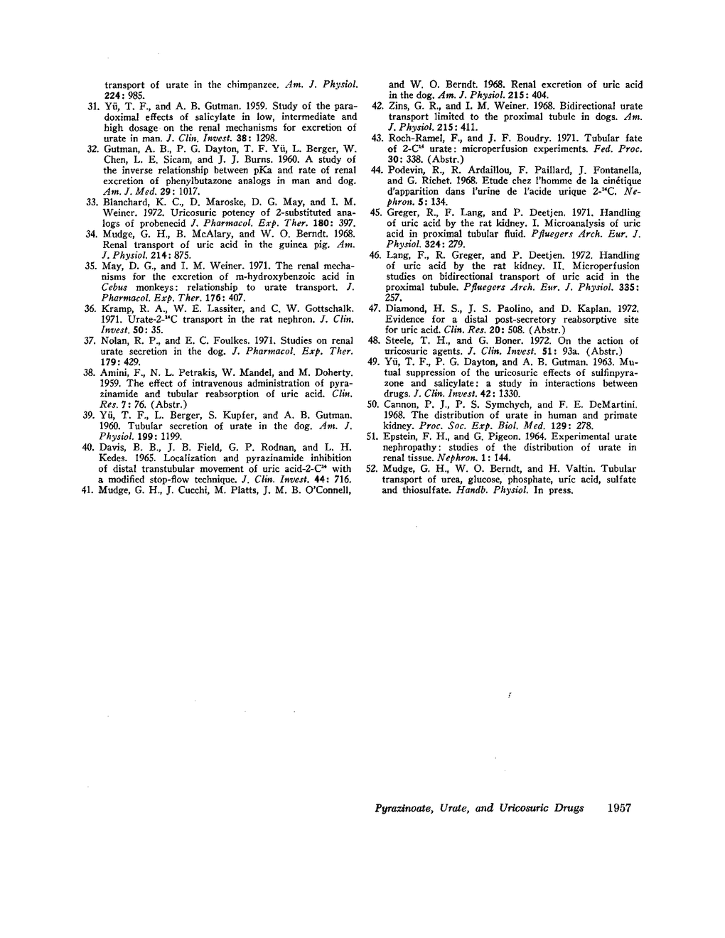 These experiments were designed to define the renal disposition of pyrazinoic acid in a nonhuman primate that is phylogenetically close to man and to relate this to the effects of pyrazinoate on urate excretion. The renal clearance of pyrazinoate was almost always greater than the simultaneous glomerular filtration rate at plasma concentrations ranging from 1.9 to 960 μg/ml. Some inhibitors of tubular secretion, probenecid, MK-282 (an experimental, potent uricosuric drug), p-aminohippurate, iodopyracet, sulfinpyrazone, and mersalyl, reduced clearances of pyrazinoate to values far below filtration rate. Chlorothiazide, allopurinol, and salicylate did not. The clearance of pyrazinoate was not influenced by changes in urine flow. It is concluded that pyrazinoate is actively secreted and actively reabsorbed.