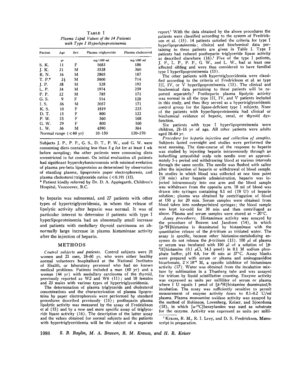 The release of histaminase activity in plasma after small intravenous of heparin was studied in 85 normal subjects and patients. In normal subjects, plasma histaminase activity (basal level, 1.7±0.1 U/ml, mean ±SEM) increased 1.6±0.2 U/ml after 10 U of heparin/kg, 8.5±2.4 U/ml after 20 U/kg, and 33±4.9 U/ml after 75 U/kg. The extent of the increase varied widely among individuals but in a particular individual the response was constant and dose-dependent. Histaminase activity rose to peak levels within 7-15 min and then declined exponentially with a half-life of 40-120 min. This pattern of response was also observed in two patients with the histaminase-producing tumor, medullary carcinoma of the thyroid. A significantly reduced response was observed, however, in 14 patients with type I hyperlipoproteinemia, a disorder in which high plasma triglyceride levels are associated with low postheparin plasma lipolytic activity. After 10 U heparin/kg, plasma histamine activity increased 0.5±0.2 U/ml, and after 75 U heparin/kg, 10.9±5.6 U/ml. In contrast, in 27 patients with other types of hyperlipoproteinemia in whom postheparin lipolytic activity was normal, the increase (2.4±0.6 U/ml) in plasma histaminase activity after 10 U heparin/kg was not significantly different from that of normal subjects. The reduced response of the plasma histaminase activity to heparin in patients with type I hyperlipoproteinemia did not appear to be due to the presence of lipemia or to an inhibitor of the enzyme in plasma. These findings suggest that many patients with type I hyperlipoproteinemia may have deficient release of both lipolytic and histaminase activities into plasma after heparin administration.