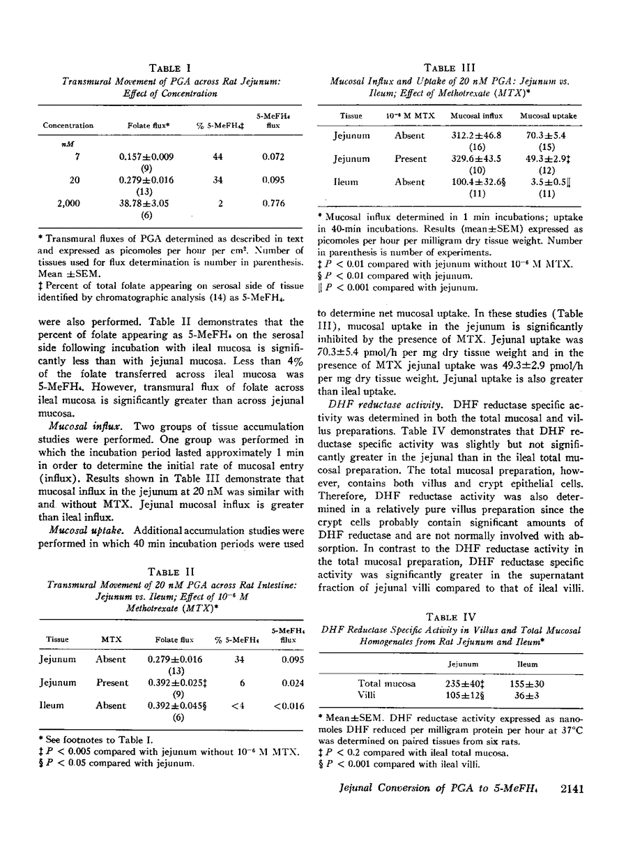 These studies were designed to determine whether pteroylmonoglutamic acid (PGA) at physiologic concentrations is transported across the small intestine unaltered or is reduced and methylated to the circulating folate form (5-methyltetrahydrofolate [5-MeFH4]) during absorption. [3H]PGA was incubated in vitro on the mucosal side of rat jejunum. Of the folate transferred to the serosal side, the percent identified as 5-MeFH4 by DEAE-Sephadex chromtography was inversely related to the initial mucosa PGA concentration: at 7, 20, and 2,000 nM, 44%, 34%, and 2%, respectively, was converted to 5-MeFH4. In contrast, less than 4% of the folate transferred across ileal mucosa was 5-MeFH4 when the initial mucosa concentration was 20 nM. Specific activity of dihydrofolate (DHF) reductase, the enzyme responsible for converting PGA to tetrahydrofolic acid, was measured in villus homogenates and was significantly greater in the jejunum than in the ileum. 1,000 nM methotrexate (MTX), a DHF reductase inhibitor, markedly inhibited PGA conversion to 5-MeFH4 by the jejunum.