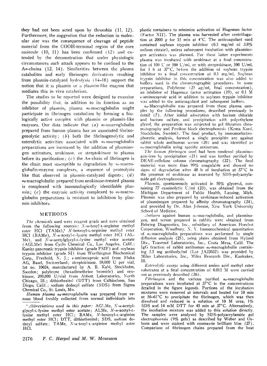 This study demonstrates that human plasma α2-macroglobulin preparations possess an enzymic activity that degrades fibrinogen, resulting in the formation of products whose structure resembles that of circulating fibrinogen catabolites. The sequence of degradation is similar to that observed in plasmin-catalyzed digests, in that Aα-chain fragmentation precedes that of Bβ-chain. The addition of plasminogen activators to plasma induced an increase in the N-α-tosyl-l-arginine methyl ester HCl esterase and fibrinogenolytic activity associated with α2-macroglobulin purified from this plasma, indicating that the enzymic activity of the complex was preserved and could be increased in the presence of other plasma enzyme inhibitors. Immunochemical studies demonstrated that an α2-macroglobulin-plasmin complex had formed in urokinase-treated plasma. This α2-macroglobulin preparation manifested an esterolytic profile like that of a complex prepared from plasmin and purified α2-macroglobulin. After complex formation with α2-macroglobulin in plasma, plasmin retained less than 0.1% of its fibrinogenolytic activity. That plasmin expressed its activity while bound to α2-macroglobulin was suggested by immunoprecipitation of this activity with α2-macroglobulin antibody and by the demonstration that pancreatic trypsin inhibitor did not effectively inhibit its fibrinogenolytic or esterolytic activity. These results raise the possibility that, in addition to its activity as a major plasma proteolytic enzyme inhibitor, α2-macroglobulin may modulate enzyme-substrate interactions, such as those resulting in the formation of circulating fibrinogen catabolites, by providing a mechanism for the preservation and protection of a portion of the enzymic activity in the presence of other circulating inhibitors.