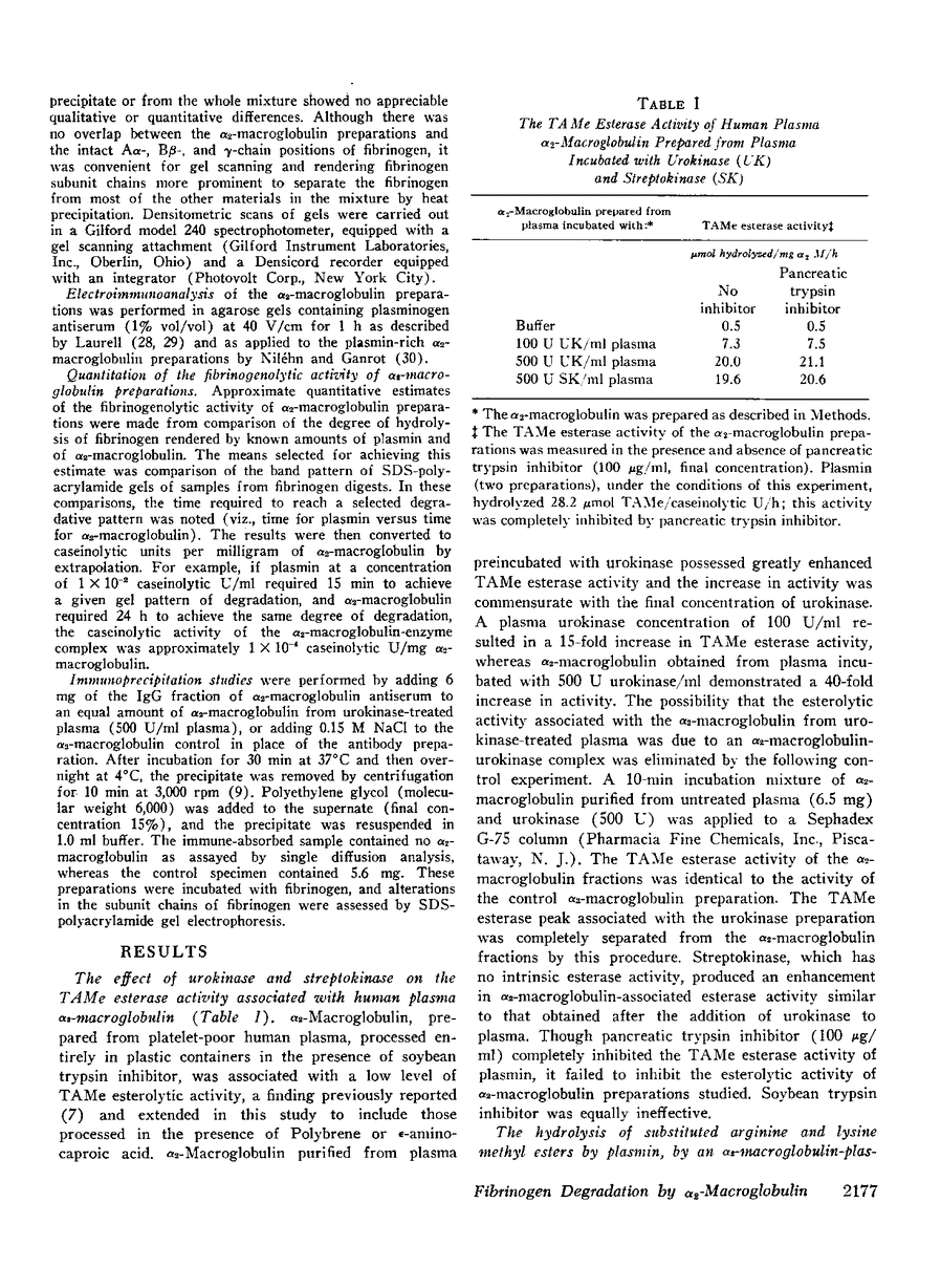 This study demonstrates that human plasma α2-macroglobulin preparations possess an enzymic activity that degrades fibrinogen, resulting in the formation of products whose structure resembles that of circulating fibrinogen catabolites. The sequence of degradation is similar to that observed in plasmin-catalyzed digests, in that Aα-chain fragmentation precedes that of Bβ-chain. The addition of plasminogen activators to plasma induced an increase in the N-α-tosyl-l-arginine methyl ester HCl esterase and fibrinogenolytic activity associated with α2-macroglobulin purified from this plasma, indicating that the enzymic activity of the complex was preserved and could be increased in the presence of other plasma enzyme inhibitors. Immunochemical studies demonstrated that an α2-macroglobulin-plasmin complex had formed in urokinase-treated plasma. This α2-macroglobulin preparation manifested an esterolytic profile like that of a complex prepared from plasmin and purified α2-macroglobulin. After complex formation with α2-macroglobulin in plasma, plasmin retained less than 0.1% of its fibrinogenolytic activity. That plasmin expressed its activity while bound to α2-macroglobulin was suggested by immunoprecipitation of this activity with α2-macroglobulin antibody and by the demonstration that pancreatic trypsin inhibitor did not effectively inhibit its fibrinogenolytic or esterolytic activity. These results raise the possibility that, in addition to its activity as a major plasma proteolytic enzyme inhibitor, α2-macroglobulin may modulate enzyme-substrate interactions, such as those resulting in the formation of circulating fibrinogen catabolites, by providing a mechanism for the preservation and protection of a portion of the enzymic activity in the presence of other circulating inhibitors.