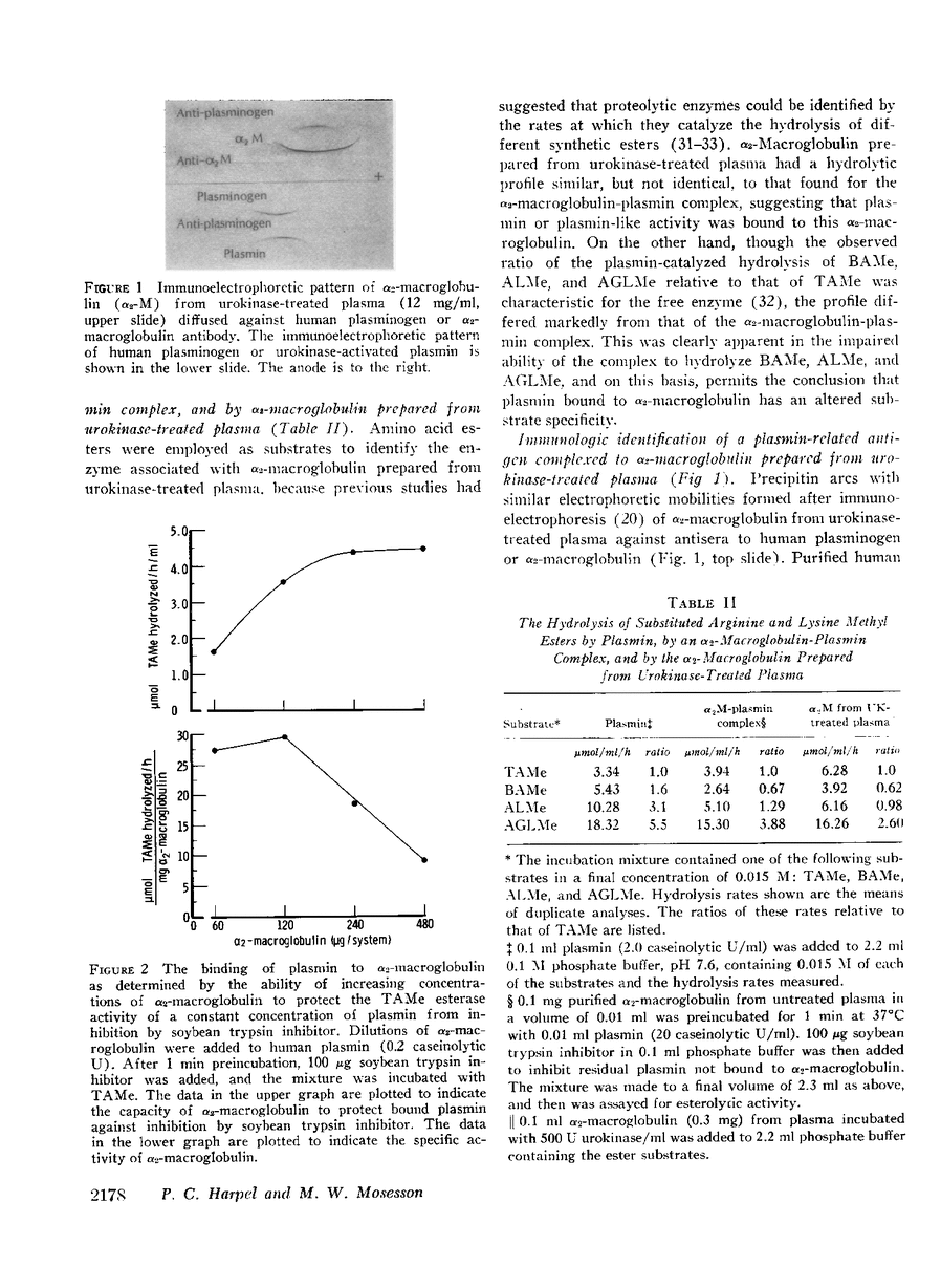 This study demonstrates that human plasma α2-macroglobulin preparations possess an enzymic activity that degrades fibrinogen, resulting in the formation of products whose structure resembles that of circulating fibrinogen catabolites. The sequence of degradation is similar to that observed in plasmin-catalyzed digests, in that Aα-chain fragmentation precedes that of Bβ-chain. The addition of plasminogen activators to plasma induced an increase in the N-α-tosyl-l-arginine methyl ester HCl esterase and fibrinogenolytic activity associated with α2-macroglobulin purified from this plasma, indicating that the enzymic activity of the complex was preserved and could be increased in the presence of other plasma enzyme inhibitors. Immunochemical studies demonstrated that an α2-macroglobulin-plasmin complex had formed in urokinase-treated plasma. This α2-macroglobulin preparation manifested an esterolytic profile like that of a complex prepared from plasmin and purified α2-macroglobulin. After complex formation with α2-macroglobulin in plasma, plasmin retained less than 0.1% of its fibrinogenolytic activity. That plasmin expressed its activity while bound to α2-macroglobulin was suggested by immunoprecipitation of this activity with α2-macroglobulin antibody and by the demonstration that pancreatic trypsin inhibitor did not effectively inhibit its fibrinogenolytic or esterolytic activity. These results raise the possibility that, in addition to its activity as a major plasma proteolytic enzyme inhibitor, α2-macroglobulin may modulate enzyme-substrate interactions, such as those resulting in the formation of circulating fibrinogen catabolites, by providing a mechanism for the preservation and protection of a portion of the enzymic activity in the presence of other circulating inhibitors.