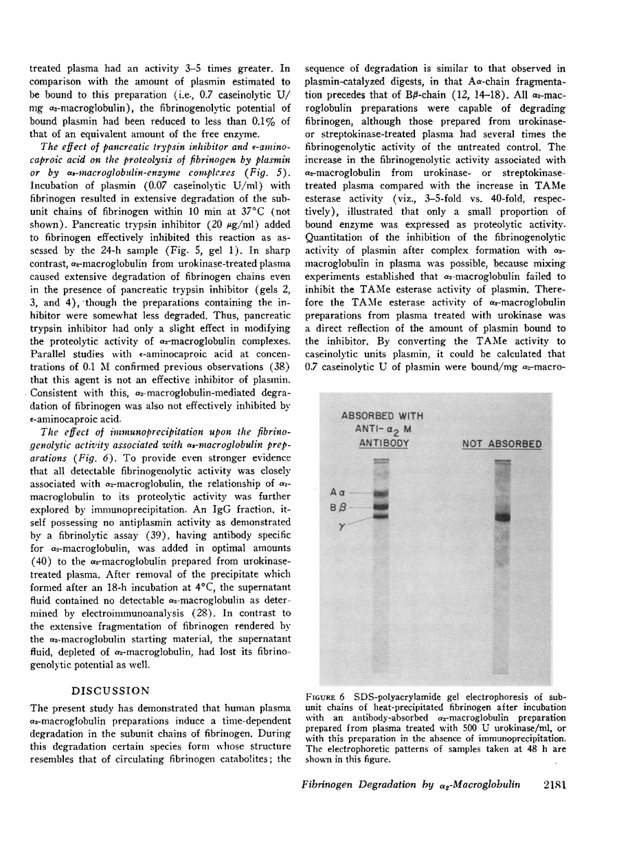 This study demonstrates that human plasma α2-macroglobulin preparations possess an enzymic activity that degrades fibrinogen, resulting in the formation of products whose structure resembles that of circulating fibrinogen catabolites. The sequence of degradation is similar to that observed in plasmin-catalyzed digests, in that Aα-chain fragmentation precedes that of Bβ-chain. The addition of plasminogen activators to plasma induced an increase in the N-α-tosyl-l-arginine methyl ester HCl esterase and fibrinogenolytic activity associated with α2-macroglobulin purified from this plasma, indicating that the enzymic activity of the complex was preserved and could be increased in the presence of other plasma enzyme inhibitors. Immunochemical studies demonstrated that an α2-macroglobulin-plasmin complex had formed in urokinase-treated plasma. This α2-macroglobulin preparation manifested an esterolytic profile like that of a complex prepared from plasmin and purified α2-macroglobulin. After complex formation with α2-macroglobulin in plasma, plasmin retained less than 0.1% of its fibrinogenolytic activity. That plasmin expressed its activity while bound to α2-macroglobulin was suggested by immunoprecipitation of this activity with α2-macroglobulin antibody and by the demonstration that pancreatic trypsin inhibitor did not effectively inhibit its fibrinogenolytic or esterolytic activity. These results raise the possibility that, in addition to its activity as a major plasma proteolytic enzyme inhibitor, α2-macroglobulin may modulate enzyme-substrate interactions, such as those resulting in the formation of circulating fibrinogen catabolites, by providing a mechanism for the preservation and protection of a portion of the enzymic activity in the presence of other circulating inhibitors.
