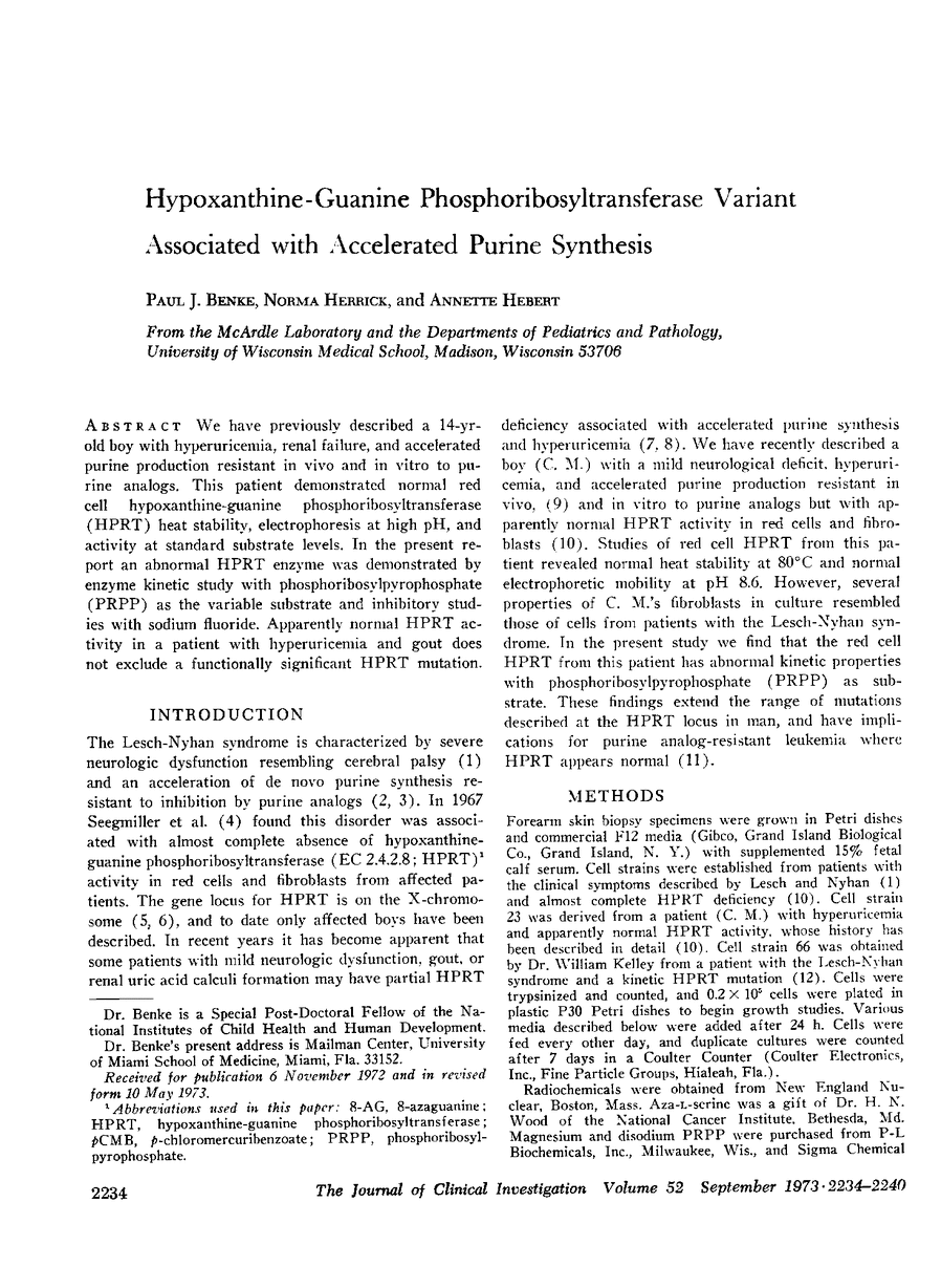We have previously described a 14-yr-old boy with hyperuricemia, renal failure, and accelerated purine production resistant in vivo and in vitro to purine analogs. This patient demonstrated normal red cell hypoxanthine-guanine phosphoribosyltransferase (HPRT) heat stability, electrophoresis at high pH, and activity at standard substrate levels. In the present report an abnormal HPRT enzyme was demonstrated by enzyme kinetic study with phosphoribosylpyrophosphate (PRPP) as the variable substrate and inhibitory studies with sodium fluoride. Apparently normal HPRT activity in a patient with hyperuricemia and gout does not exclude a functionally significant HPRT mutation.