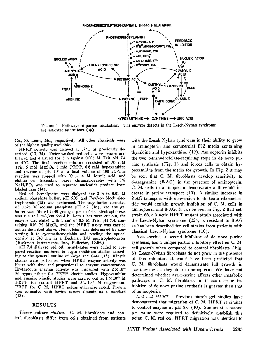 We have previously described a 14-yr-old boy with hyperuricemia, renal failure, and accelerated purine production resistant in vivo and in vitro to purine analogs. This patient demonstrated normal red cell hypoxanthine-guanine phosphoribosyltransferase (HPRT) heat stability, electrophoresis at high pH, and activity at standard substrate levels. In the present report an abnormal HPRT enzyme was demonstrated by enzyme kinetic study with phosphoribosylpyrophosphate (PRPP) as the variable substrate and inhibitory studies with sodium fluoride. Apparently normal HPRT activity in a patient with hyperuricemia and gout does not exclude a functionally significant HPRT mutation.