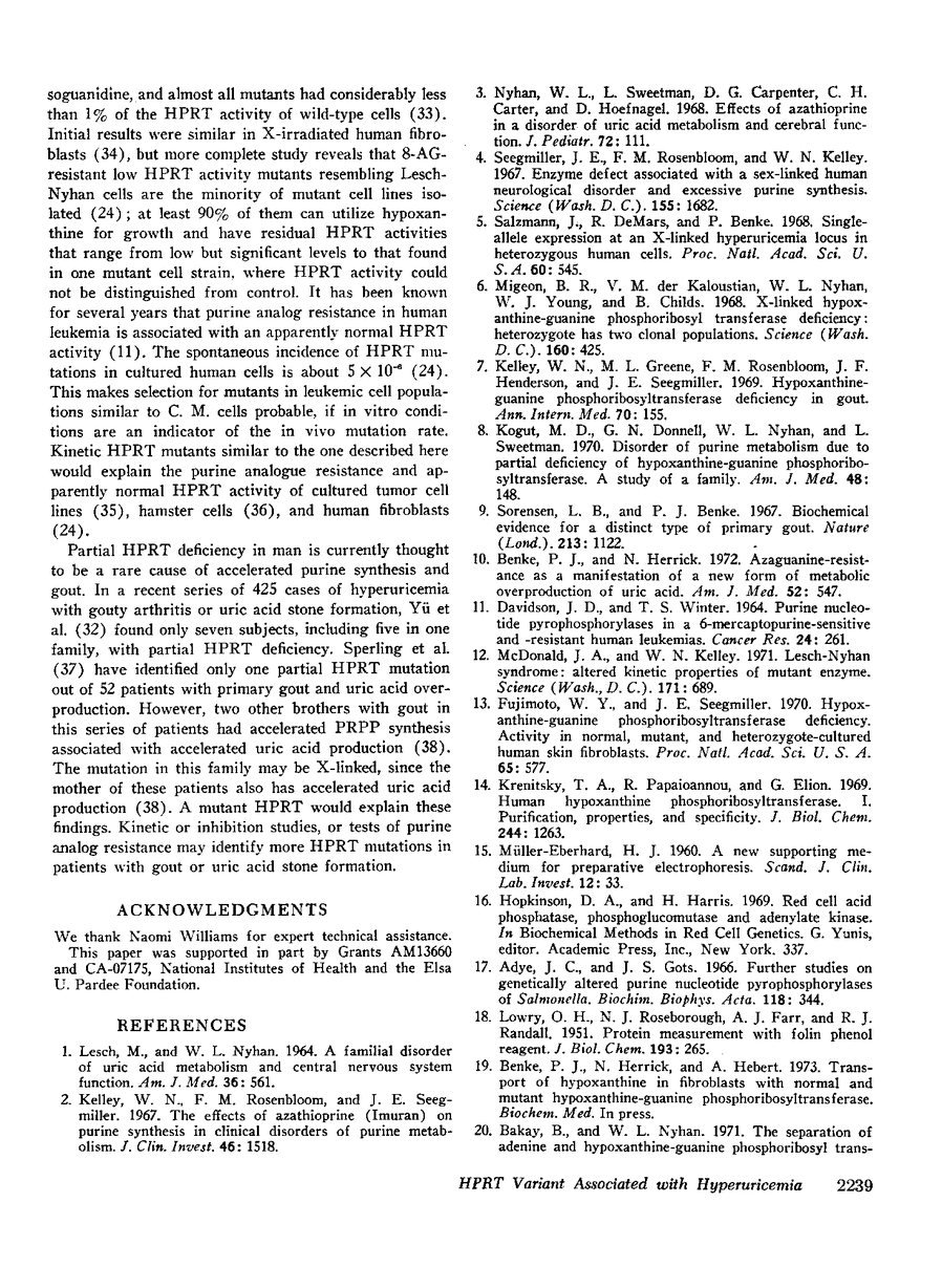 We have previously described a 14-yr-old boy with hyperuricemia, renal failure, and accelerated purine production resistant in vivo and in vitro to purine analogs. This patient demonstrated normal red cell hypoxanthine-guanine phosphoribosyltransferase (HPRT) heat stability, electrophoresis at high pH, and activity at standard substrate levels. In the present report an abnormal HPRT enzyme was demonstrated by enzyme kinetic study with phosphoribosylpyrophosphate (PRPP) as the variable substrate and inhibitory studies with sodium fluoride. Apparently normal HPRT activity in a patient with hyperuricemia and gout does not exclude a functionally significant HPRT mutation.