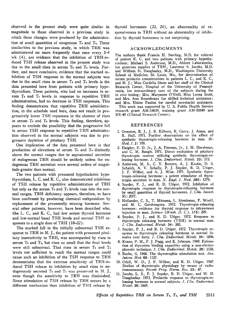 Repetitive administration of thyrotropin-releasing hormone (TRH) to human subjects was used to produce small elevations of endogenous serum triiodothyronine (T3) and thyroxine (T4) levels and thereby to determine the effect of these small elevations on the serum thyrotropin (TSH) response to subsequent doses of TRH. Each subject received 13 consecutive doses of 25 μg TRH at 4-h intervals. Serum T3, T4, and TSH levels were measured before the 1st, 7th, and 13th doses (“basal levels”) and for the 4 h after each of these doses.