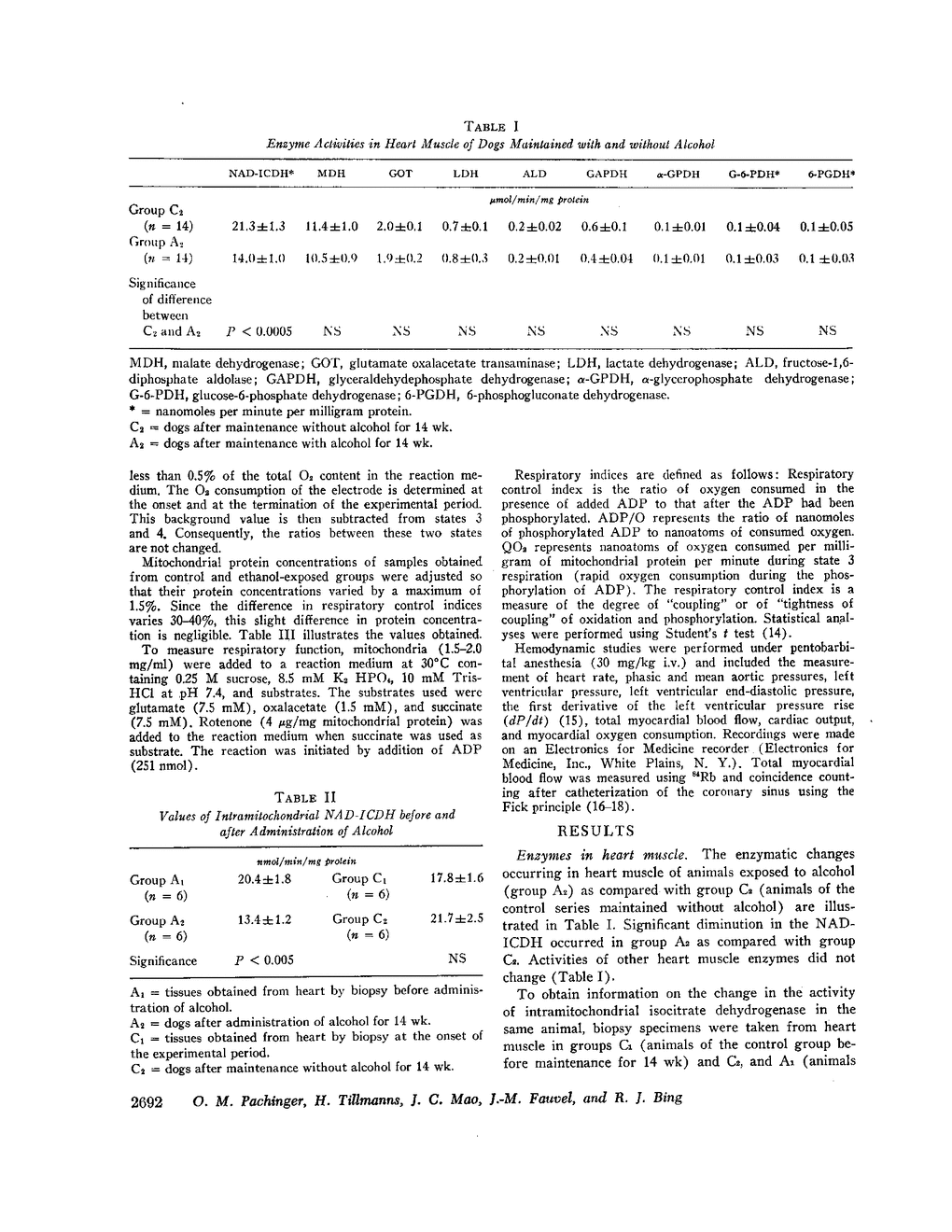 The effect of prolonged administration of alcohol on mitochondrial function and high-energy phosphate (ATP) of heart muscle was investigated in dogs. Animals were divided into two groups, a control group and a group that received alcohol. In the experimental series, dogs received 400 ml of a 25% solution of alcohol added to the food and drinking water. Measurements were carried out after ethanol had been withheld for 2 days. Total myocardial blood flow, cardiac output, and myocardial O2 consumption remained at control levels. Measurement of cardiac contractility using the maximal rate of left ventricular pressure rise (dP/dtmax) showed no change in animals exposed to alcohol. When the afterload of the heart was increased with angiotensin, a slight but not significant decline in cardiac contractility was observed. Activities of various intramitochondrial and extramitochondrial enzymes were measured in both groups. After alcohol administration, the primarily intramitochondrial isocitrate dehydrogenase diminished. ATP in heart muscle of dogs exposed to alcohol declined, and mitochondrial oxygen consumption and respiratory control indices diminished. These observations suggest that the primary lesion leading to alteration of myocardial performance is a biochemical malfunction of the mitochondria, which at this early stage is not reflected in changes in myocardial contractility.