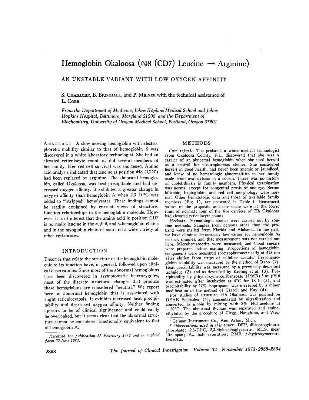 A slow-moving hemoglobin with electrophoretic mobility similar to that of hemoglobin S was discovered in a white laboratory technologist. She had an elevated reticulocyte count, as did several members of her family. Her red cell survival was shortened. Amino acid analysis indicated that leucine at position β48 (CD7) had been replaced by arginine. The abnormal hemoglobin, called Okaloosa, was heat-precipitable and had decreased oxygen affinity. It exhibited a greater change in oxygen affinity than hemoglobin A when 2,3 DPG was added to “stripped” hemolysates. These findings cannot be readily explained by current views of structure-function relationships in the hemoglobin molecule. However, it is of interest that the amino acid in position CD7 is normally leucine in the α, β, δ, and γ-hemoglobin chains and in the myoglobin chain of man and a wide variety of other vertebrates.