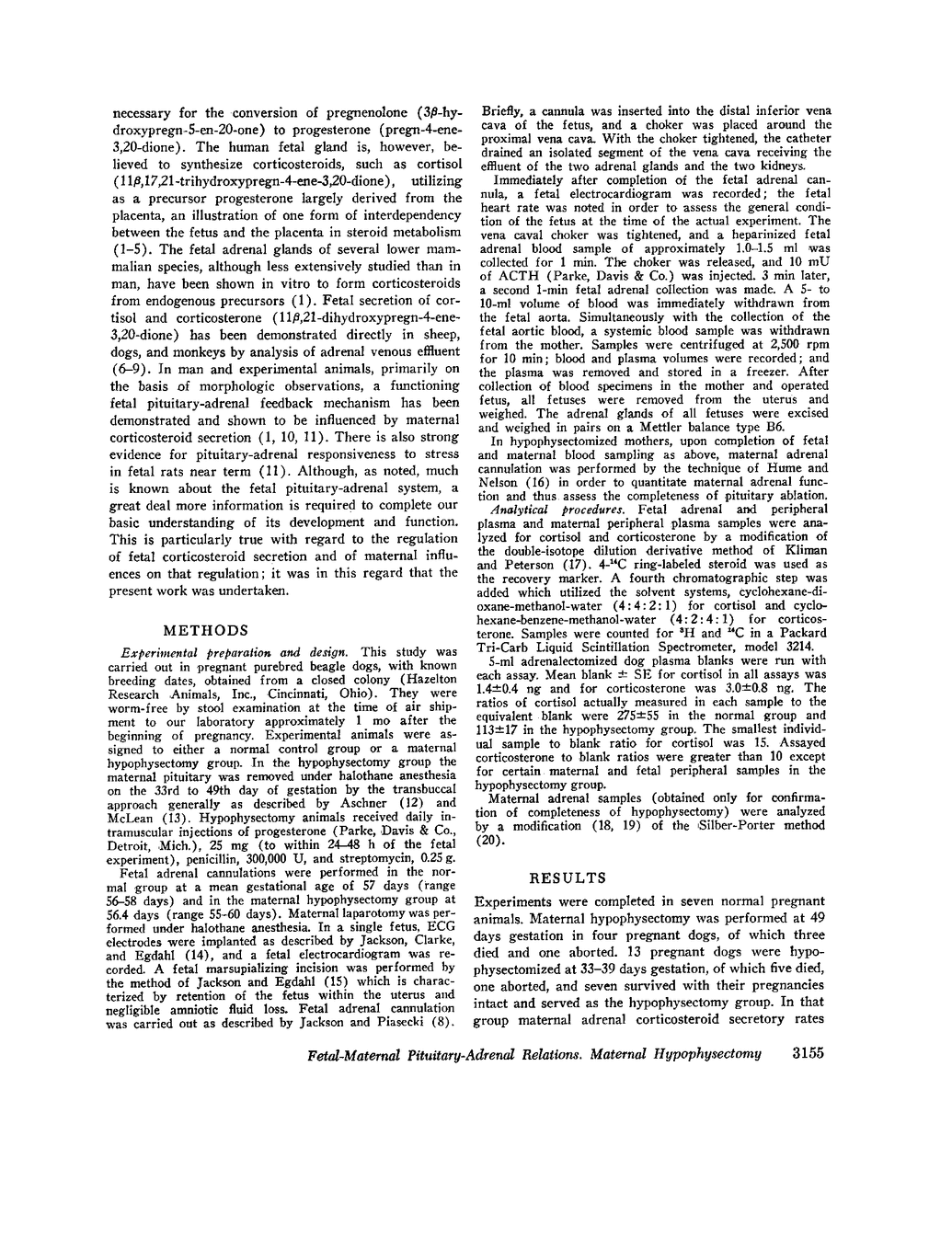 Even though certain aspects of the fetal pituitary-adrenal system have been extensively studied, much remains to be learned of its basic development and function. In the present work, the effect of maternal hypophysectomy upon quantitative pituitary-adrenal relations in mother and fetus was investigated in pregnant beagle dogs. At 57 days gestation in each of seven normal animals and seven animals 3 wk posthypophysectomy, a cannula for collection of adrenal effluent was placed in a single fetus in utero under halothane anesthesia. A timed fetal adrenal sample was obtained; ACTH (10 mU) was injected into the fetus; 3 min thereafter a second fetal adrenal sample was collected and fetal and maternal peripheral arterial samples were drawn. All fetuses and their adrenal glands were weighed. Concentrations of cortisol and corticosterone were determined by a modification of the double-isotope dilution derivative method of Kliman and Peterson.