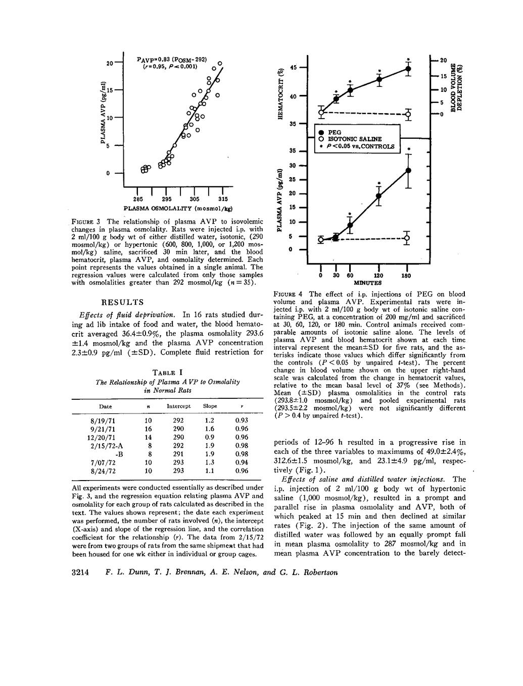 A sensitive and specific radioimmunoassay for plasma arginine vasopressin (AVP) has been used to study the effects of blood osmolality and volume in regulating AVP secretion in unanesthetized rats. Under basal conditions, plasma AVP and osmolality were relatively constant, averaging 2.3±0.9 (SD) pg/ml and 294±1.4 mosmol/kg, respectively. Fluid restriction, which increased osmolality and decreased volume, resulted in a progressive rise in plasma AVP to about 10 times basal levels after 96 h. A 2-3-fold increase in plasma AVP occurred as early as 12 h, when osmolality and volume had each changed by less than 2%. Intraperitoneal injections of hypertonic saline, which had no effect on blood volume, also produced a rise in plasma AVP that was linearly correlated with the rise in osmolality (r > 0.9) and quantitatively similar to that found during fluid restriction (plasma AVP increased 2-4-fold with each 1% increase in osmolality). Intraperitoneal injection of polyethylene glycol, which decreased blood volume without altering osmolality, also increased plasma AVP but this response followed an exponential pattern and did not become significant until volume had decreased by 8% or more. At these levels of hypovolemia, the osmoregulatory system continued to function but showed a lower threshold and increase sensitivity to osmotic stimulation. We conclude that AVP secretion is regulated principally by blood osmolality but that the responsiveness of this mechanism may be significantly altered by modest changes in blood volume.