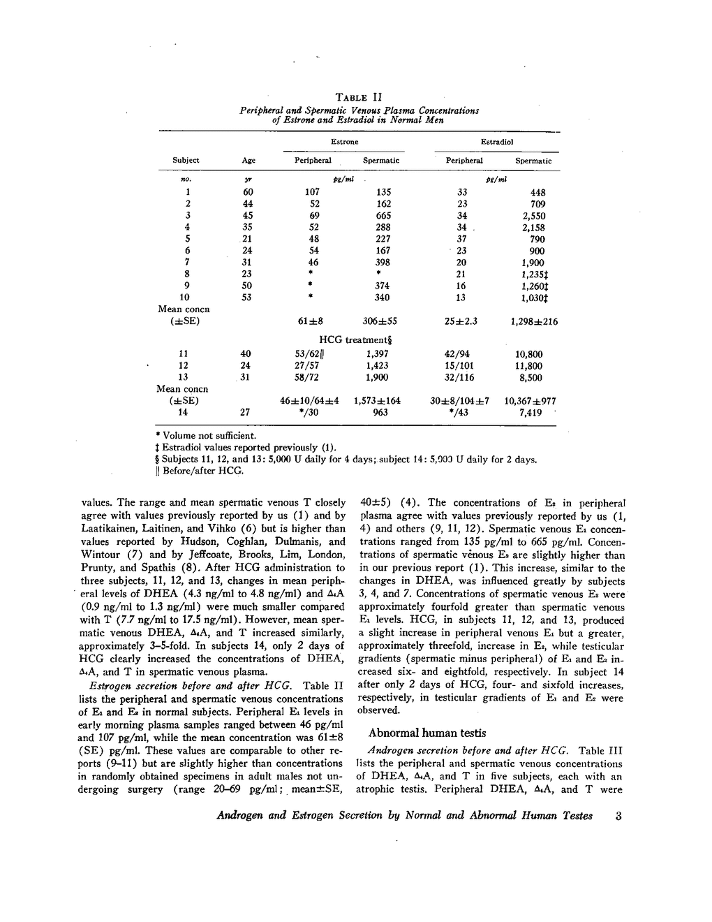 The secretion of androgens and estrogens by normal and abnormal testes was compared by determining the concentrations of dehydroepiandrosterone (DHEA), androstenedione (Δ4A), testosterone (T), estrone (E1), and 17β-estradiol (E2) in peripheral and spermatic venous plasma samples from 14 normal men and 5 men with unilateral testicular atrophy. Four normal men and one patient with unilateral atrophy of the testis were given human chorionic gonadotropin (HCG) before surgery. Plasma estrogens were determined by radioimmunoassay; plasma androgens were measured by the double-isotope dilution derivative technique. Peripheral concentrations of these steroids before and after HCG were similar in both the normal men and the patients with unilateral testicular atrophy. In normal men, the mean ±SE spermatic venous concentrations were DHEA, 73.1±11.7 ng/ml; Δ4A, 30.7±7.9 ng/ml; T, 751±114 ng/ml; E1, 306±55 pg/ml; and E2, 1298±216 pg/ml. Three of four subjects with unilateral testicular atrophy had greatly diminished spermatic venous levels of androgens and estrogens. HCG treatment increased the testicular secretion of DHEA and T fivefold, Δ4A threefold, E1 sixfold, and E2 eightfold in normal men. In the single subject with an atrophic testis who received HCG, the spermatic venous concentrations of androgens and estrogens were much less than in normal men similarly treated. We conclude that: (a) E1 is secreted by the human testis, but testicular secretion of E1 accounts for less than 5% of E1 production in normal men; (b) HCG stimulation produces increases in spermatic venous estrogens equal to or greater than the changes in androgens, including testosterone; and (c) strikingly decreased secretion of androgen and estrogen by unilateral atrophic human tests cannot be appreciated by analyses of peripheral steroid concentrations.
