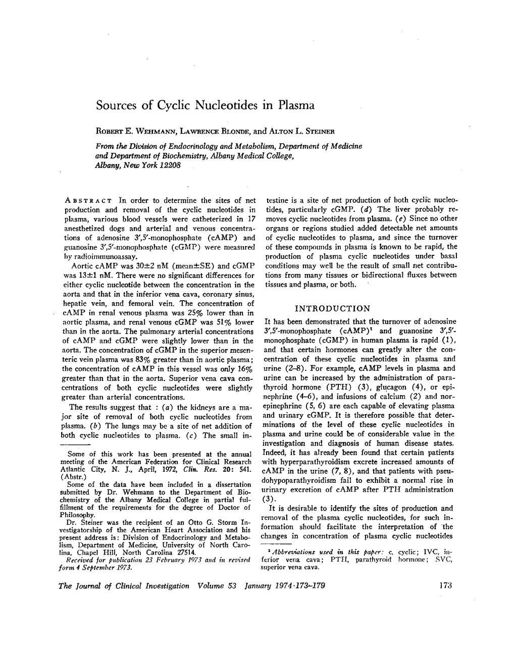 In order to determine the sites of net production and removal of the cyclic nucleotides in plasma, various blood vessels were catheterized in 17 anesthetized dogs and arterial and venous concentrations of adenosine 3′,5′-monophosphate (cAMP) and guanosine 3′,5′-monophosphate (cGMP) were measured by radioimmunoassay.