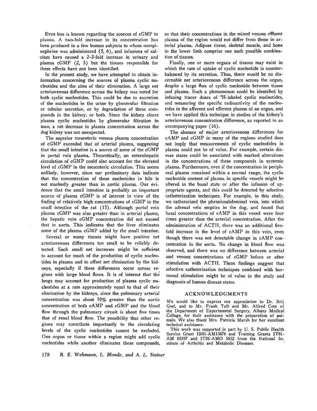 In order to determine the sites of net production and removal of the cyclic nucleotides in plasma, various blood vessels were catheterized in 17 anesthetized dogs and arterial and venous concentrations of adenosine 3′,5′-monophosphate (cAMP) and guanosine 3′,5′-monophosphate (cGMP) were measured by radioimmunoassay.