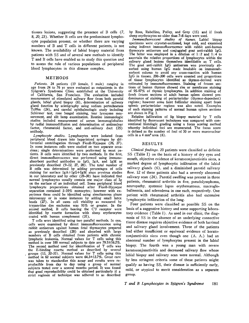 Lymphocyte heterogeneity was studied in peripheral blood and salivary gland lesions in 24 patients with Sjögren's syndrome. Peripheral blood B cells, measured by immunofluorescence with specific antiserum to immunoglobulins or by rosette assay with complementcoated erythrocytes, were increased in most patients. Peripheral blood T cells, measured by immunofluorescence with rabbit antiserum to human thymocytes or by rosette assay with sheep erythrocytes, were reduced in eight patients. Three had associated rheumatoid arthritis, two had a generalized lymphoproliferative disorder, and one each had scleroderma, systemic lupus erythematosus, and neuropathy.