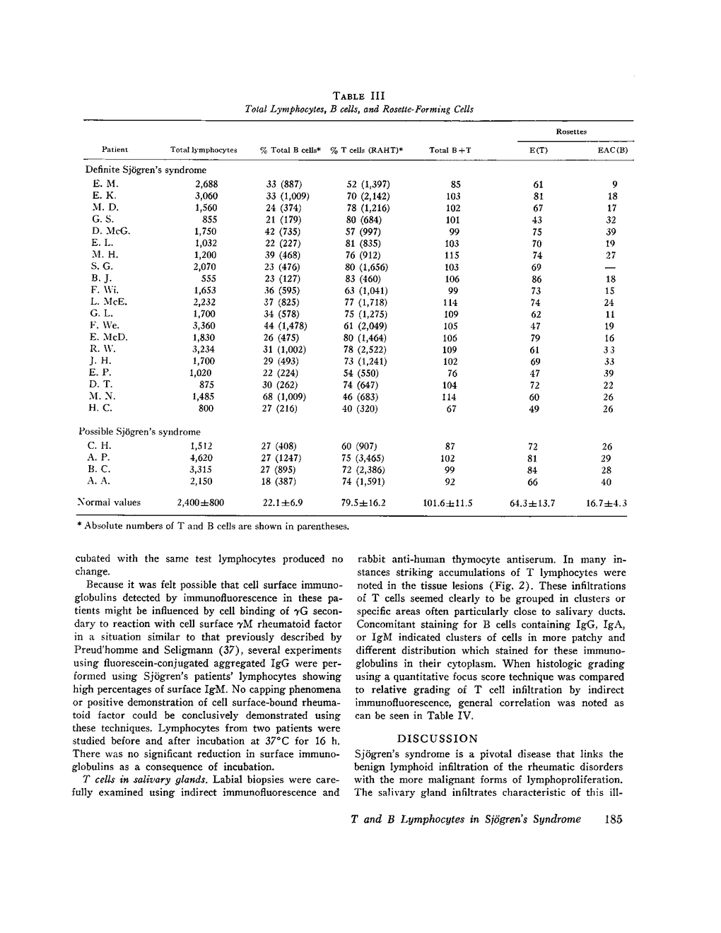 Lymphocyte heterogeneity was studied in peripheral blood and salivary gland lesions in 24 patients with Sjögren's syndrome. Peripheral blood B cells, measured by immunofluorescence with specific antiserum to immunoglobulins or by rosette assay with complementcoated erythrocytes, were increased in most patients. Peripheral blood T cells, measured by immunofluorescence with rabbit antiserum to human thymocytes or by rosette assay with sheep erythrocytes, were reduced in eight patients. Three had associated rheumatoid arthritis, two had a generalized lymphoproliferative disorder, and one each had scleroderma, systemic lupus erythematosus, and neuropathy.