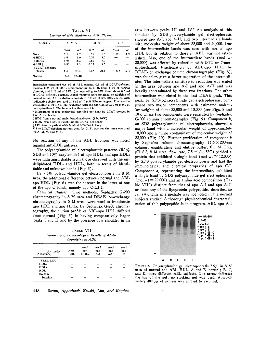 The serum lipoproteins of five patients with abetalipoproteinemia (ABL) were separated by ultracentrifugation and then analyzed either intact or after delipidation. In accord with previous findings, all of the patients lacked serum particles with the characteristics of normal low-density lipoproteins (LDL) and of the LDL apoprotein as assessed by immunochemical methods. Each patient exhibited on every examination an abnormal particle, "LDL", which had the flotational properties of LDL, the polypeptide makeup of high-density lipoproteins HDL, the spectral and morphological characteristics of neither LDL nor HDL, and a relatively low content of cholesteryl esters. The HDL were abnormal in having a marked decrease in their total plasma content, an altered proportion of the subclasses HDL2 and HDL3, and a peculiar polypeptide distribution, comprising both normal and additional components, usually not seen in normal controls. The patients also exhibited a decrease of plasma lecithin-cholesterol acyl transferase (LCAT) activity which probably accounted for the low content of cholesteryl esters in both "LDL" and HDL, and in turn for the unusual appearance of "LDL" on electron microscopy. It is concluded that ABL is a disorder affecting all serum lipoprotein classes. Whether the abetalipoproteinemia previously described and noted in the current studies is related to or independent of the abnormalities observed in the other lipoproteins was not established. How the deficiency of LCAT activity, observed in all patients studied, contributed to some of the observed structural lipoprotein abnormalities also remained undetermined.