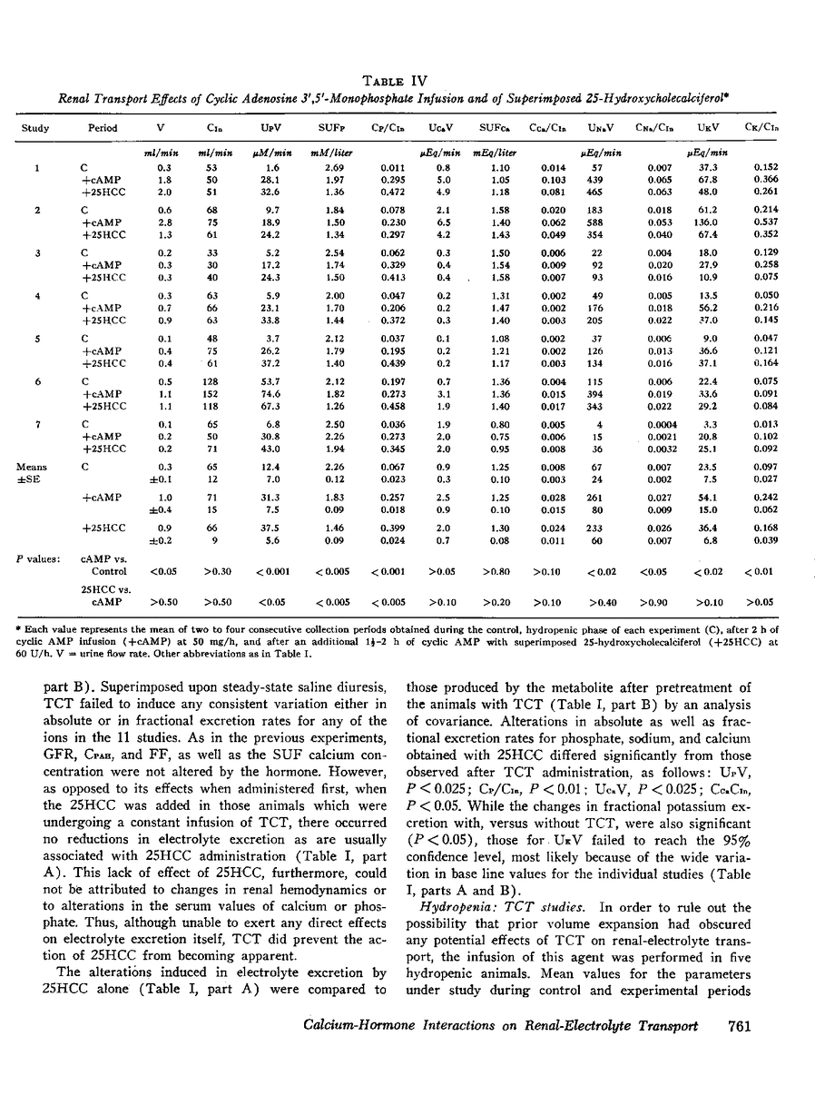 Acute clearance studies were performed in thyroparathyroidectomized animals to determine the actions and interactions of thyrocalcitonin (TCT), cyclic adenosine 3′5′-monophosphate (cAMP), 25-hydroxycholecalciferol (25HCC), and calcium ion on the reabsorption of phosphate, calcium, sodium, and potassium by the kidney. The infusion of 25HCC in a dosage of 60 U/h to moderately saline-expanded animals (2.5% body weight) induced a fall in the excretion of all of the ions under study after 90-120 min similar to that observed in previous experiments from this laboratory. Mean decrements in fractional excretion were: phosphate, 42.0% (P < 0.005); calcium, 25.0% (P < 0.005); sodium, 23.4% (P < 0.001); and potassium, 14.7% (P < 0.005). The superimposition of either porcine or salmon TCT (1-100 MRC U/h for 2 h) resulted in no further alterations in electrolyte excretion. However, the infusion of TCT during steady-state saline expansion, before the administration of 25HCC, obviated the renal transport effects of the vitamin D metabolite. Both in the latter studies, as well as those in which similar doses of TCT were given to hydropenic animals, the hormone itself failed to induce any consistent alteration in electrolyte excretion. Cyclic AMP (50 mg/h) caused an increase in the excretion of phosphate, sodium, and potassium and no change in calcium excretion. Like TCT, the nucleotide blocked the action of 25HCC on the kidney. Raising the mean level of serum ultrafilterable calcium to 3.02±0.25 mEq/liter from 1.62±0.17 mEq/liter likewise prevented enhanced ionic reabsorption due to 25HCC.