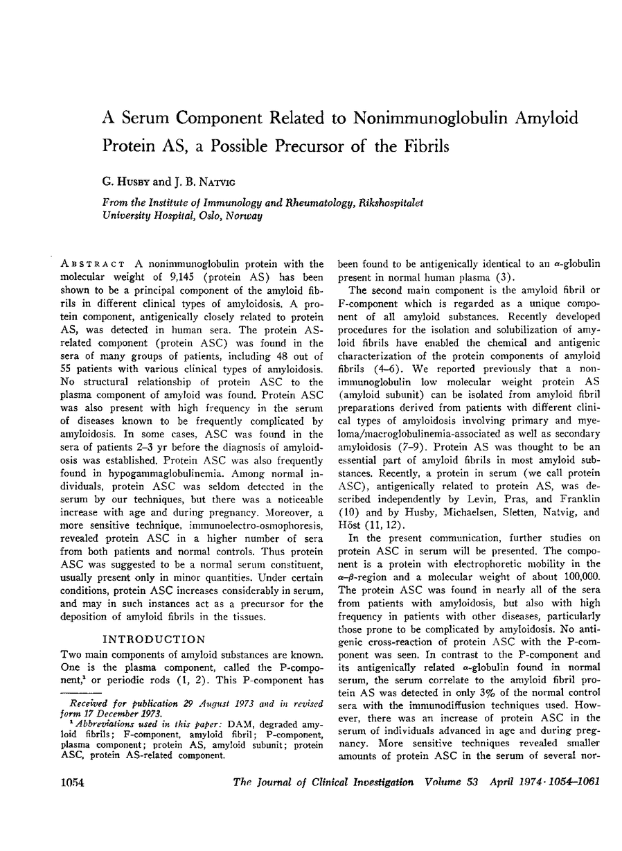 A nonimmunoglobulin protein with the molecular weight of 9,145 (protein AS) has been shown to be a principal component of the amyloid fibrils in different clinical types of amyloidosis. A protein component, antigenically closely related to protein AS, was detected in human sera. The protein AS-related component (protein ASC) was found in the sera of many groups of patients, including 48 out of 55 patients with various clinical types of amyloidosis. No structural relationship of protein ASC to the plasma component of amyloid was found. Protein ASC was also present with high frequency in the serum of diseases known to be frequently complicated by amyloidosis. In some cases, ASC was found in the sera of patients 2-3 yr before the diagnosis of amyloidosis was established. Protein ASC was also frequently found in hypogammaglobulinemia. Among normal individuals, protein ASC was seldom detected in the serum by our techniques, but there was a noticeable increase with age and during pregnancy. Moreover, a more sensitive technique, immunoelectro-osmophoresis, revealed protein ASC in a higher number of sera from both patients and normal controls. Thus protein ASC was suggested to be a normal serum constituent, usually present only in minor quantities. Under certain conditions, protein ASC increases considerably in serum, and may in such instances act as a precursor for the deposition of amyloid fibrils in the tissues.