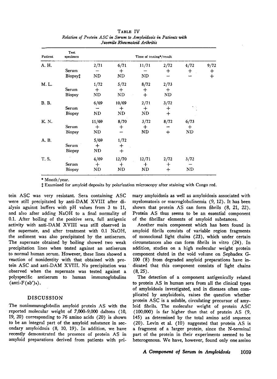 A nonimmunoglobulin protein with the molecular weight of 9,145 (protein AS) has been shown to be a principal component of the amyloid fibrils in different clinical types of amyloidosis. A protein component, antigenically closely related to protein AS, was detected in human sera. The protein AS-related component (protein ASC) was found in the sera of many groups of patients, including 48 out of 55 patients with various clinical types of amyloidosis. No structural relationship of protein ASC to the plasma component of amyloid was found. Protein ASC was also present with high frequency in the serum of diseases known to be frequently complicated by amyloidosis. In some cases, ASC was found in the sera of patients 2-3 yr before the diagnosis of amyloidosis was established. Protein ASC was also frequently found in hypogammaglobulinemia. Among normal individuals, protein ASC was seldom detected in the serum by our techniques, but there was a noticeable increase with age and during pregnancy. Moreover, a more sensitive technique, immunoelectro-osmophoresis, revealed protein ASC in a higher number of sera from both patients and normal controls. Thus protein ASC was suggested to be a normal serum constituent, usually present only in minor quantities. Under certain conditions, protein ASC increases considerably in serum, and may in such instances act as a precursor for the deposition of amyloid fibrils in the tissues.