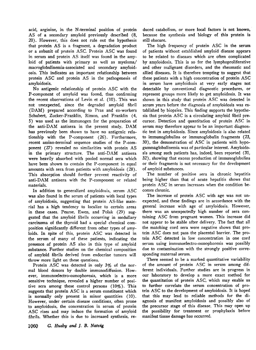 A nonimmunoglobulin protein with the molecular weight of 9,145 (protein AS) has been shown to be a principal component of the amyloid fibrils in different clinical types of amyloidosis. A protein component, antigenically closely related to protein AS, was detected in human sera. The protein AS-related component (protein ASC) was found in the sera of many groups of patients, including 48 out of 55 patients with various clinical types of amyloidosis. No structural relationship of protein ASC to the plasma component of amyloid was found. Protein ASC was also present with high frequency in the serum of diseases known to be frequently complicated by amyloidosis. In some cases, ASC was found in the sera of patients 2-3 yr before the diagnosis of amyloidosis was established. Protein ASC was also frequently found in hypogammaglobulinemia. Among normal individuals, protein ASC was seldom detected in the serum by our techniques, but there was a noticeable increase with age and during pregnancy. Moreover, a more sensitive technique, immunoelectro-osmophoresis, revealed protein ASC in a higher number of sera from both patients and normal controls. Thus protein ASC was suggested to be a normal serum constituent, usually present only in minor quantities. Under certain conditions, protein ASC increases considerably in serum, and may in such instances act as a precursor for the deposition of amyloid fibrils in the tissues.