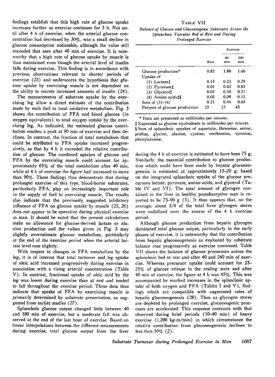 Arterial concentrations and substrate exchange across the leg and splanchnic vascular beds were determined for glucose, lactate, pyruvate, glycerol, individual acidic and neutral amino acids, and free fatty acids (FFA) in six subjects at rest and during 4 h of exercise at approximately 30% of maximal oxygen uptake. FFA turnover and regional exchange were evaluated using 14C-labeled oleic acid.