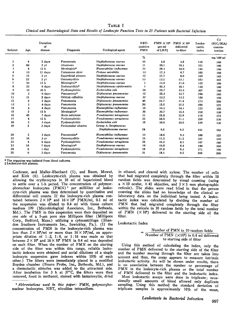 To determine if changes in neutrophil leukocyte function occur during active bacterial infection, the neutrophils of 25 patients with active bacterial infection and 25 age-matched controls were compared for leukotactic activity, random mobility, and nitroblue tetrazolium reduction. The neutrophil leukocytes of patients with bacterial infection were hyperactive in unidirectional movement toward a chemotactic stimulus as measured in the leukotactic assay and usually had increased nitroblue tetrazolium reduction. The mean leukotactic index was 165±56 in patients with bacterial infection and 70±11 in controls (P < 0.001). After 7-10 days of appropriate therapy with clinical and bacteriological response, leukotactic activity returned to normal values. A hyperactive leukotactic response continued, however, in patients with persisting bacterial infection. The hyperactive leukotactic response of circulating neutrophils appears to be an early and sensitive event in the inflammatory cycle stimulated by bacterial infection and may aid in the localization of invading bacteria.