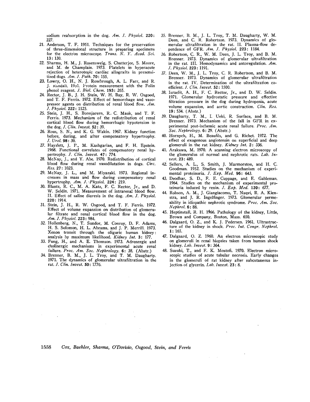 To further evaluate the mechanism of the oliguria of acute renal failure, a model was utilized in which intense and prolonged vasoconstriction produced the unilateral cessation of urine flow. The radioactive microsphere method was used to measure total and regional blood flow before and after the intrarenal infusion of norepinephrine, 0.75 μg/kg/min, for 2 h in the dog. In the control kidney, renal blood flow increased 32% 48 h after norepinephrine in association with a fall in the fractional distribution of flow to the outer cortex. In the experimental kidney, total renal blood flow fell from 190 ml/min before norepinephrine to 116 ml/min at 48 h (P < 0.025) with a uniform reduction in cortical blood flow. After the administration of 10% body wt Ringer's solution, there was a marked redistribution of flow to inner cortical nephrons in both the control and experimental kidney. In addition, there was a marked increase in total blood flow in both kidneys. On the experimental side, flow rose to 235 ml/min, a value greater than in either the control period (P < 0.05) or at 48 h after norepinephrine (P < 0.001). However, in spite of this marked increase in blood flow, there was essentially no urine flow from the experimental kidney. In separate studies, the animals were prepared for micropuncture. In all studies, the surface tubules were collapsed, and there was no evidence of tubular obstruction or leakage of filtrate. Over 99% of the 15-μM spheres were extracted in one pass through the experimental kidney. An analysis of the forces affecting filtration suggested that an alteration in the ultrafiltration coefficient may be responsible, at least in part, for the anuria in this model. In this regard, transmission and scanning electron microscopy revealed a marked abnormality in the epithelial structure of the glomerulus. It is suggested that a decrease in glomerular capillary permeability may be present in this model of acute renal failure.