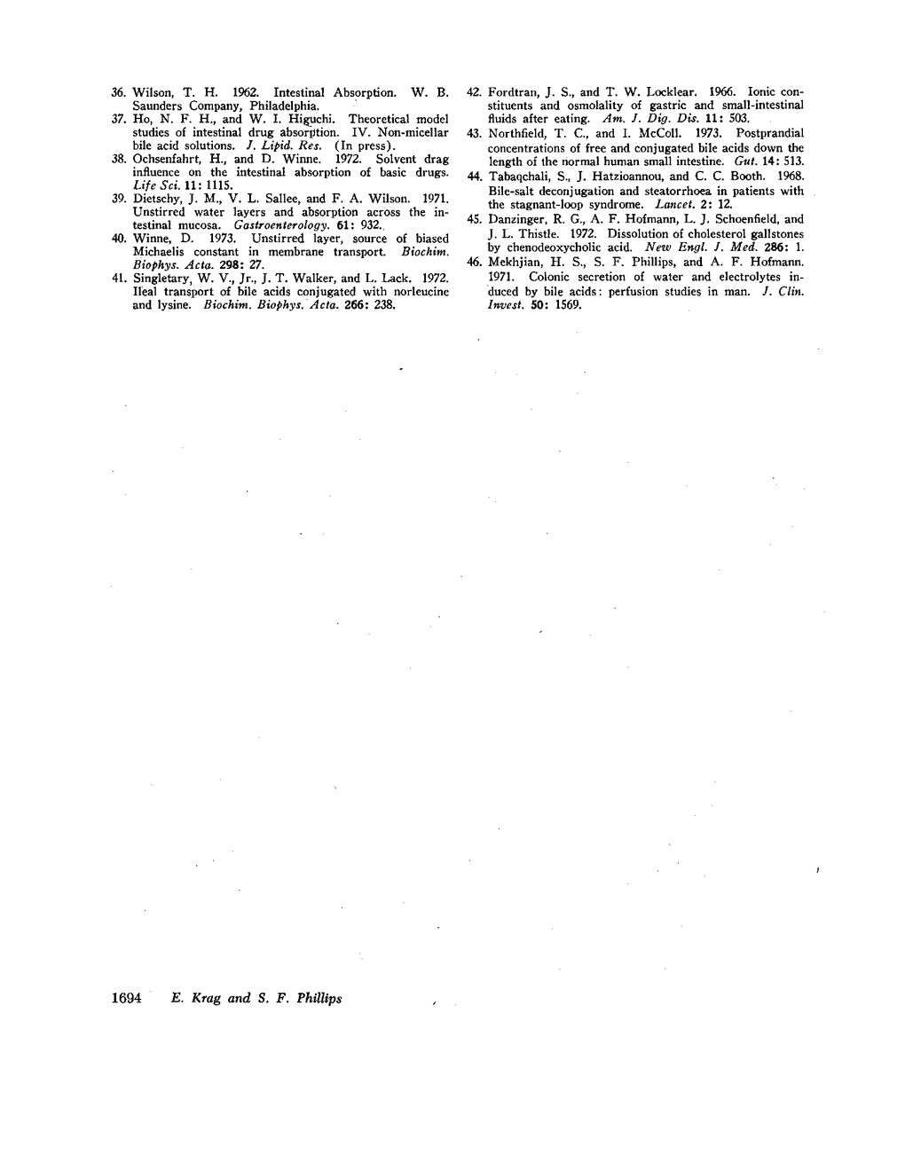 Absorption of the major human bile acids was studied in 12 healthy volunteers by steady state perfusion of the ileum in 112 experiments and of the jejunum in 48 experiments. Use of a randomized order of four perfusions on 1 day of study and use of up to 4 consecutive days of study in a subject allowed important comparisons of data from the same individuals. That there is active ileal absorption of chenodeoxycholic, glycochenodeoxycholic, and taurocholic acids in man was supported by the finding of saturation kinetics and of competition for absorption among conjugated bile acids. Values for apparent kinetic constants (apparent maximal transport velocity [*Vmax] and apparent Michaelis constant) in man are similar to those in other species. The ileum absorbed chenodeoxycholic acid more rapidly than its glycine conjugate, due mainly to a ninefold greater permeability for the free acid. Taurocholate had the highest *Vmax and was absorbed more rapidly than glycochenodeoxycholate. Passive permeability of the jejunum to bile acids was twice that of the ileum, and the permeabilities to free and glycine-conjugated chenodeoxycholate were in the same ratio as in the ileum (9: 1). Jejunal permeability to chenodeoxycholic acid was three times that to cholic acid. Variation of intraluminal pH by up to 1.4 units did not influence jejunal uptake of free bile acids. These results, which are comparable with those from animal experiments, provide a basis for estimation of intestinal reabsorption of bile acids in intact man.
