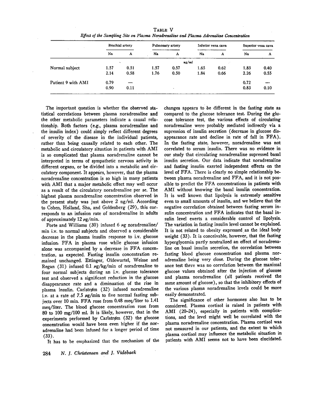 Blood glucose, glucose tolerance, serum insulin, free fatty acids in serum, plasma noradrenaline, and plasma adrenaline were measured in 10 patients with acute myocardial infarction (AMI) as well as in healthy subjects. Both noradrenaline and adrenaline in plasma were elevated in patients with AMI, the level being fairly constant in the individual patients and dependent on their degree of illness.