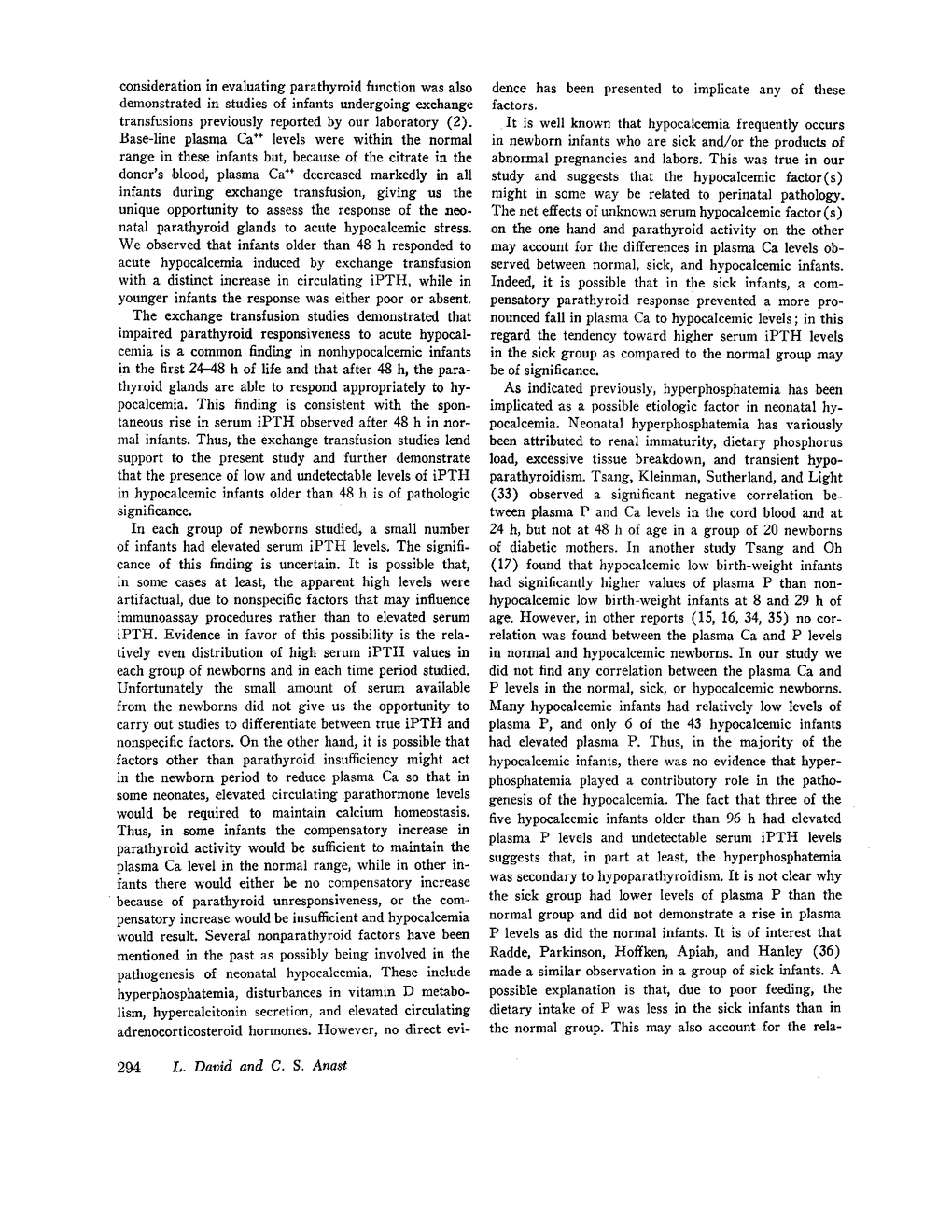 Serum immunoreactive parathyroid hormone (iPTH) and plasma total calcium, ionized calcium, magnesium, and phosphorus levels were determined during the first 9 days of life in 137 normal term infants, 55 “sick” infants, and 43 hypocalcemic (Ca <7.5 mg/100 ml; Ca++<4.0 mg/100 ml) infants.