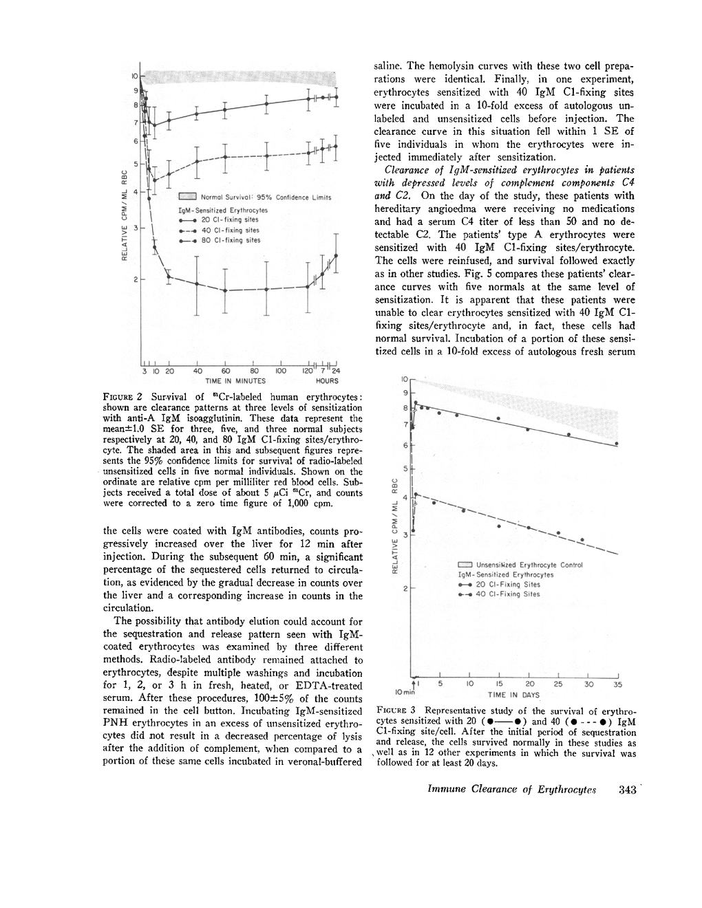 Purified human IgM isoagglutinins were utilized to sensitize 51Cr-labeled erythrocytes so as to produce a known number of complement-fixing sites. These cells were then reinfused into the erythrocyte donor. A minimum of 20 C1-fixing sites/erythrocyte were required for decreased survival. As the amount of antibody coating the erythrocytes was increased, a larger percentage was sequestered. With 80 C1-fixing sites, more than 75% of the injected erythrocytes were removed from the circulation within 10 min. In each case, the clearance pattern consisted of rapid hepatic sequestration followed by a gradual return of a portion of the erythrocytes into the circulation where they survived normally.