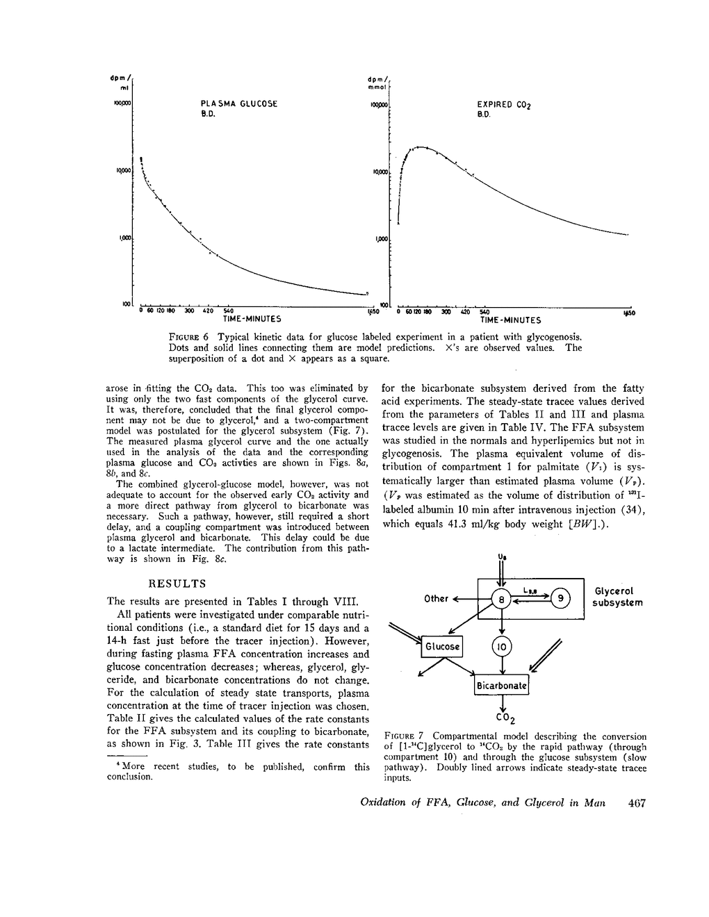 Palmitate, glucose, and glycerol oxidation to CO2 have been investigated in the fasted state in ten normal subjects and nine patients (six hyperlipoproteinemias, one xanthomatosis, and two glycogenosis) after intravenous injection of [1-14C]palmitate, [1-14C]glucose, or [1-14C]glycerol in tracer amounts. The specific activities and concentrations of plasma palmitate, glycerol, or glucose and expired CO2 were measured at various intervals after the injection for a period of 24 h. All the studies were analyzed in terms of a multicompartment model describing the structure for each of the subsystems, the transfer of carbon label between subsystems, and the oxidation to CO2. A bicarbonate subsystem was also included in the model to account for its role in shaping the CO2 curves.