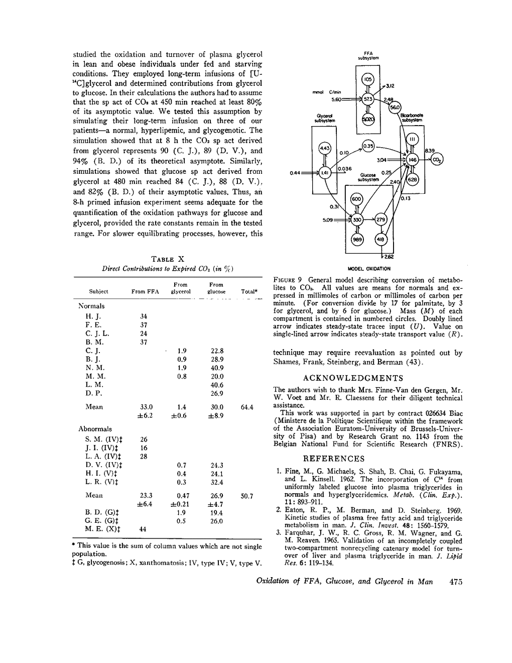 Palmitate, glucose, and glycerol oxidation to CO2 have been investigated in the fasted state in ten normal subjects and nine patients (six hyperlipoproteinemias, one xanthomatosis, and two glycogenosis) after intravenous injection of [1-14C]palmitate, [1-14C]glucose, or [1-14C]glycerol in tracer amounts. The specific activities and concentrations of plasma palmitate, glycerol, or glucose and expired CO2 were measured at various intervals after the injection for a period of 24 h. All the studies were analyzed in terms of a multicompartment model describing the structure for each of the subsystems, the transfer of carbon label between subsystems, and the oxidation to CO2. A bicarbonate subsystem was also included in the model to account for its role in shaping the CO2 curves.